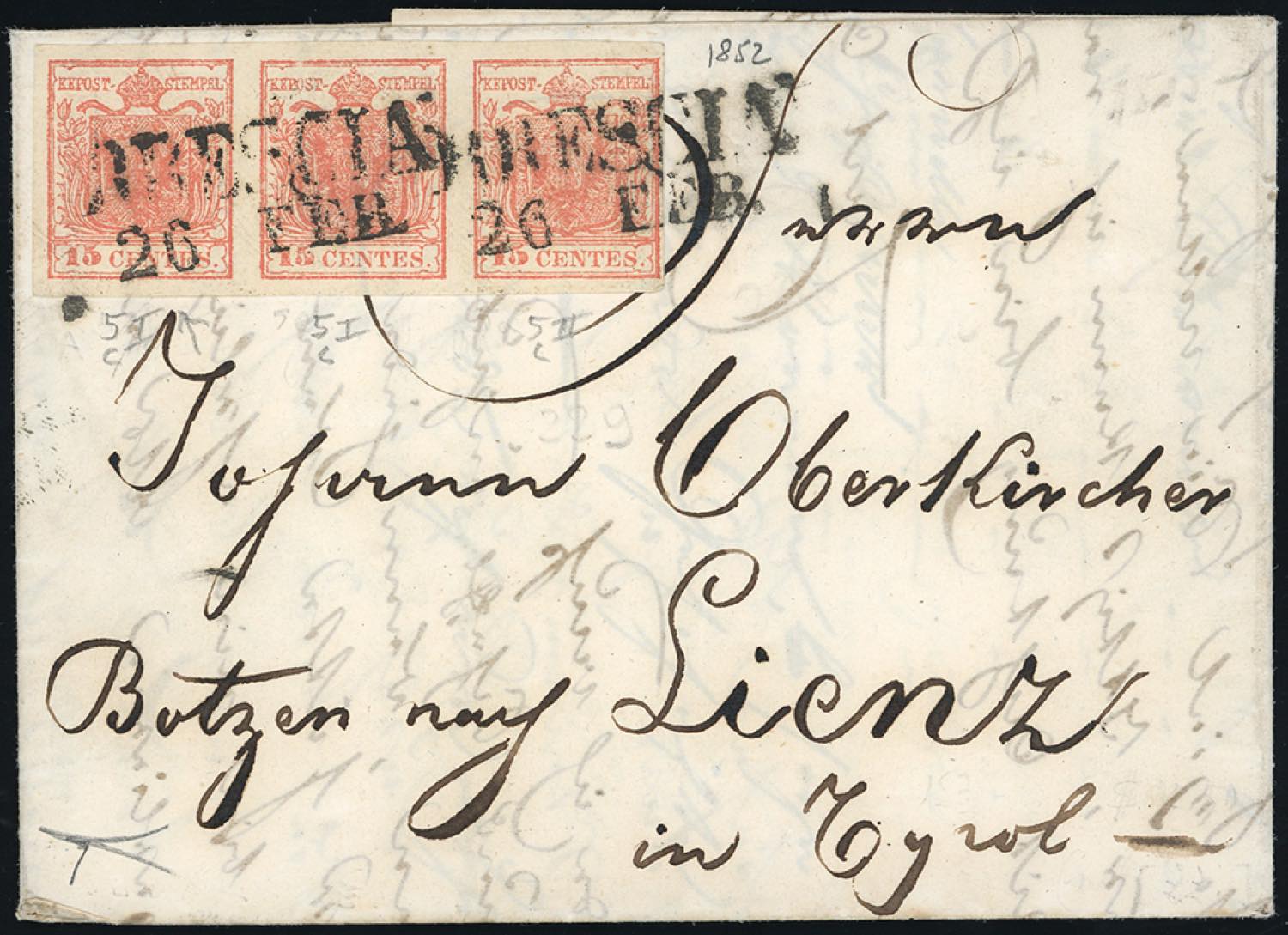 1852 - 15 cent. rosa carnicino, striscia di tre contenente i due sottotipi (5c), perfetta, su fresca lettera da Brescia 26/1/1852 a Lienz, in Tirolo. Molto bella! Bottacchi.