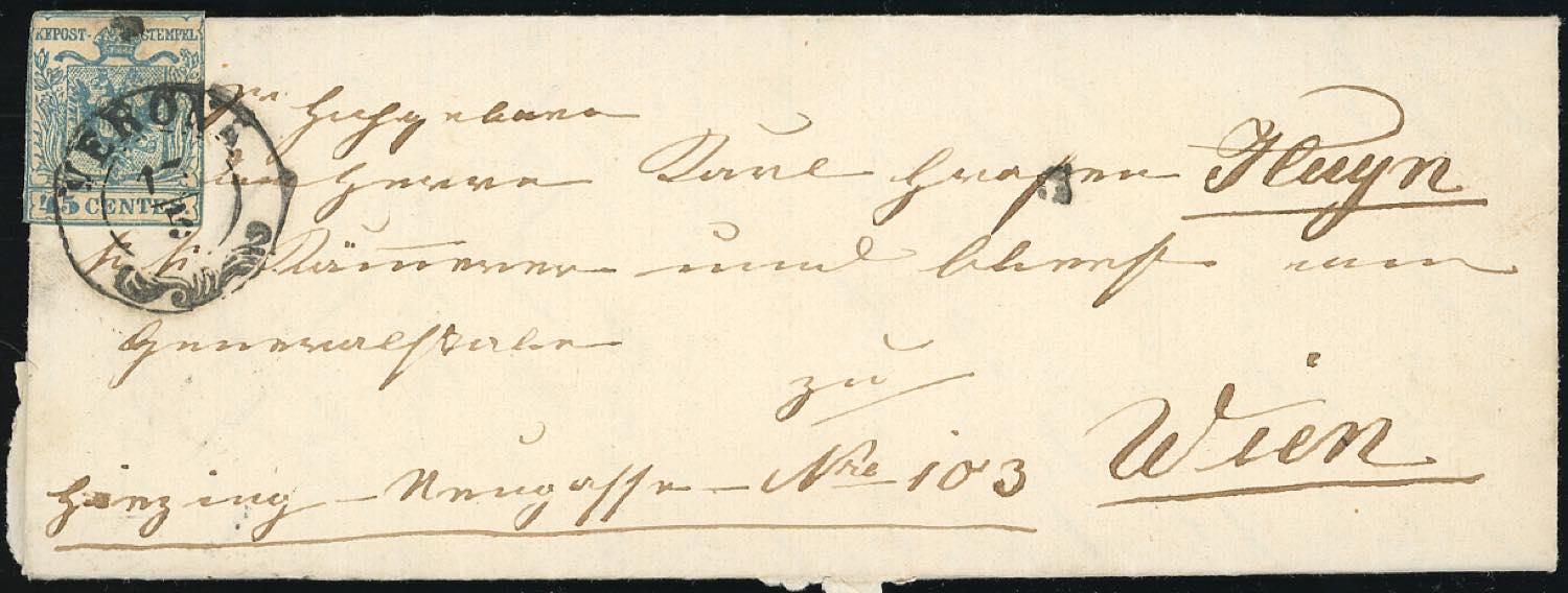 1854 - 45 cent. azzurro ardesia, II tipo, carta a mano (11), tagliato "lilliput" lungo i margini, su lettera da Verona 13/05/1854 a Vienna.