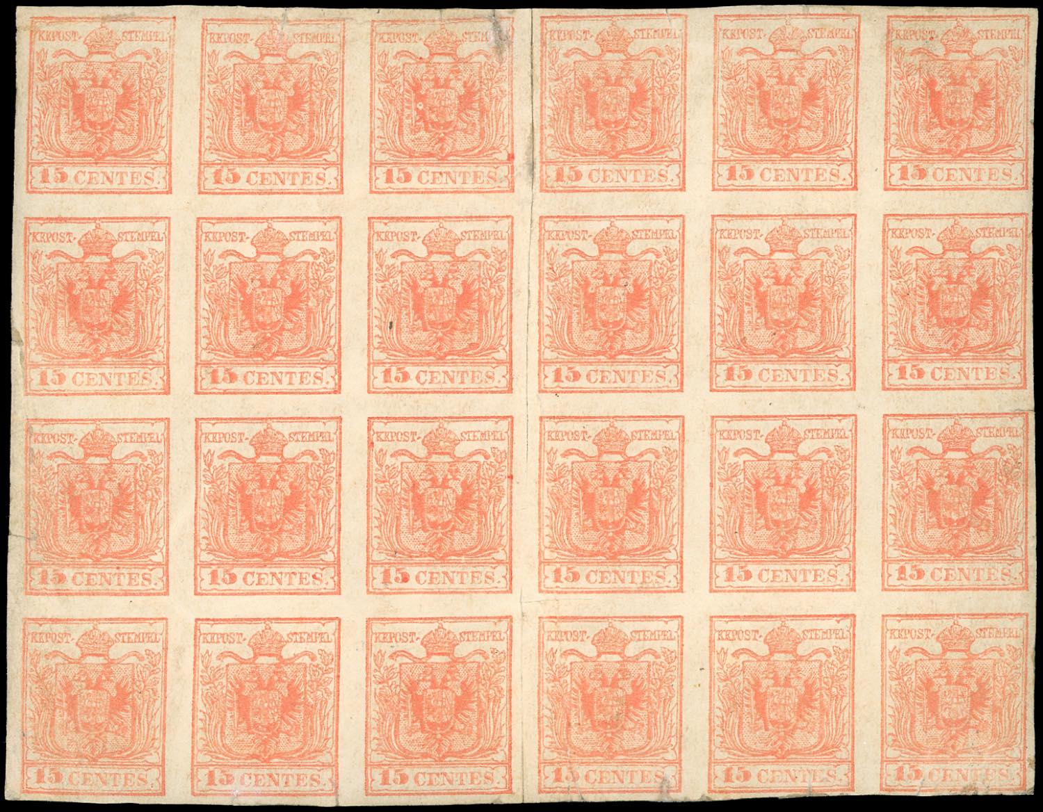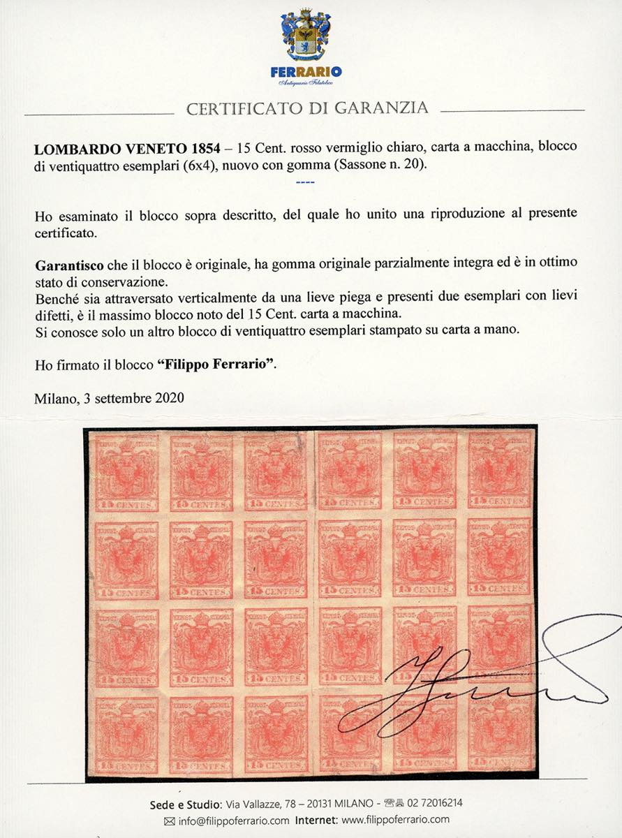 1854 - 15 cent. rosso vermiglio chiaro, carta a macchina (20), blocco di 24 esemplari (6x4), nuovo, gomma originale parzialmente integra. Il blocco è attraversato verticalmente da una lieve piega, quattro esemplari con lievi difetti, gli altri perfetti. INSIEME UNICO E STRAORDINARIO di grande impatto visivo. Cert. Ferrario. Dal certificato di Alberto Diena: "Data la rarità del blocco (non ne conosco che un altro di ugual numero di esemplari, ma carta a mano), l'ho firmato per esteso".