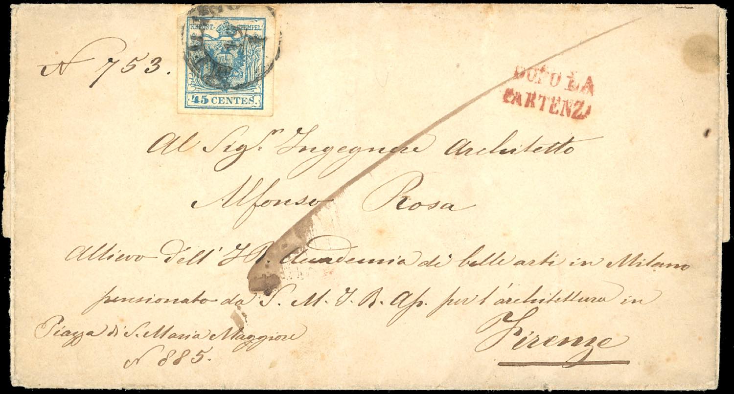 1858 - 45 cent. azzurro, III tipo, carta a macchina (22), ottimo stato, su sovracoperta di lettera da Milano 19/1/1858 a Firenze, bollo rosso "dopo la partenza".