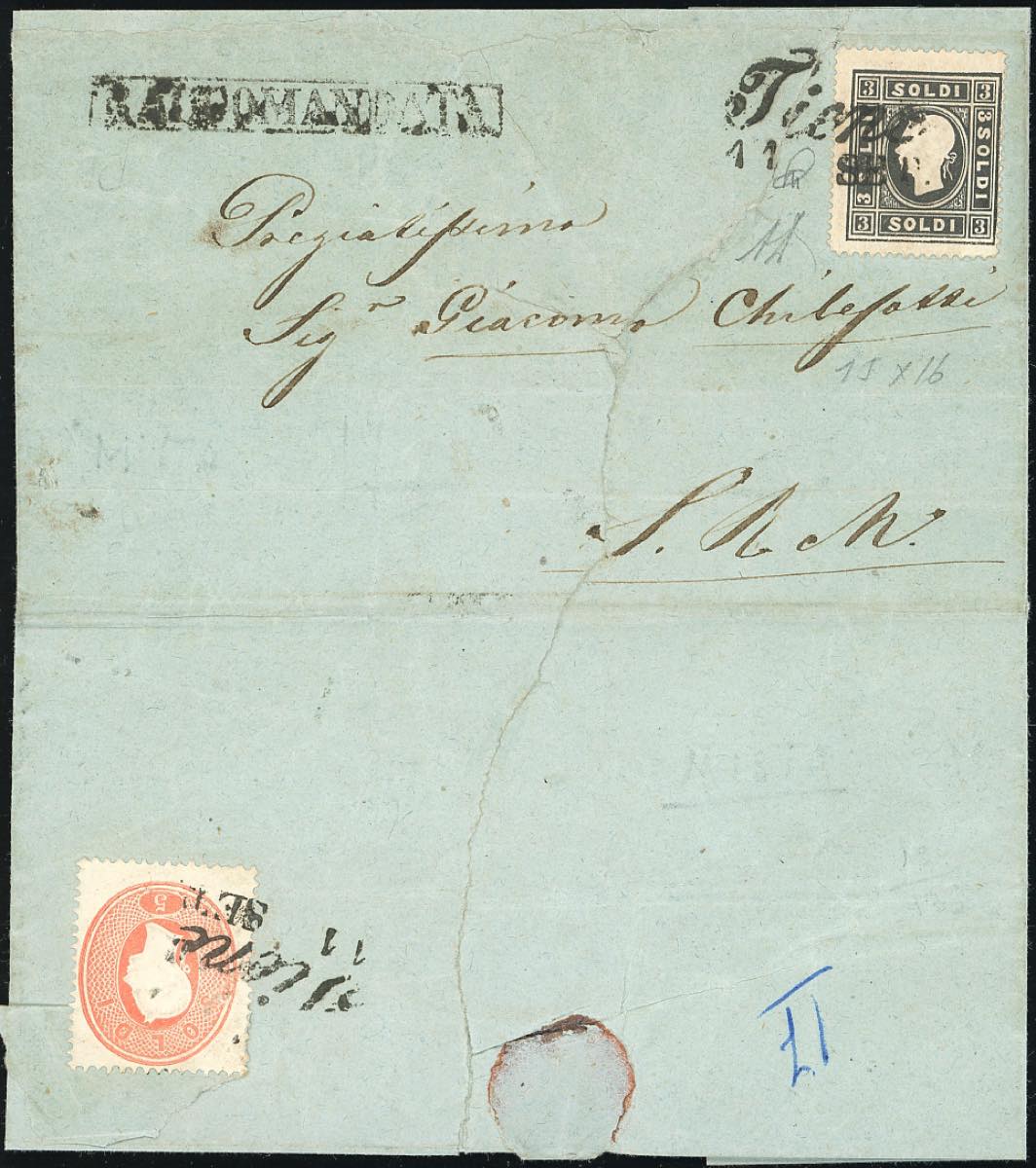 1861 - 3 soldi nero, I tipo, dent. 15 x 16, e, al verso, 5 soldi rosso (24A,33), perfetti, su sovracoperta, incompleta al verso, di lettera raccomandata da Tiene 11/9/1861 per città. Affrancatura e tariffa per città interessanti.