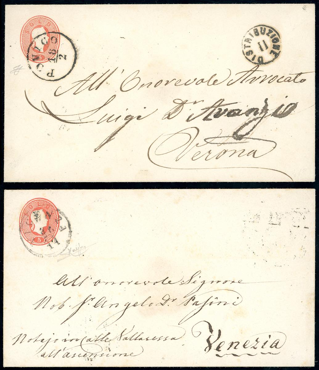 1861 - 5 soldi rosso, busta postale di formato piccolo (10), due esemplari di tonalità differente spediti rispettivamente da Vicenza 26/11 a Venezia e da Rovigo 18/2 a Verona. La prima firmata Raybaudi, l'altra Ferrario.