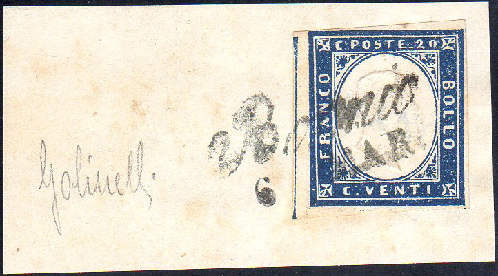 BORMIO, Cor. punti 10 - 20 cent. (Sardegna 15Cb), perfetto, usato su frammento il 6/3/1860. Golinelli.