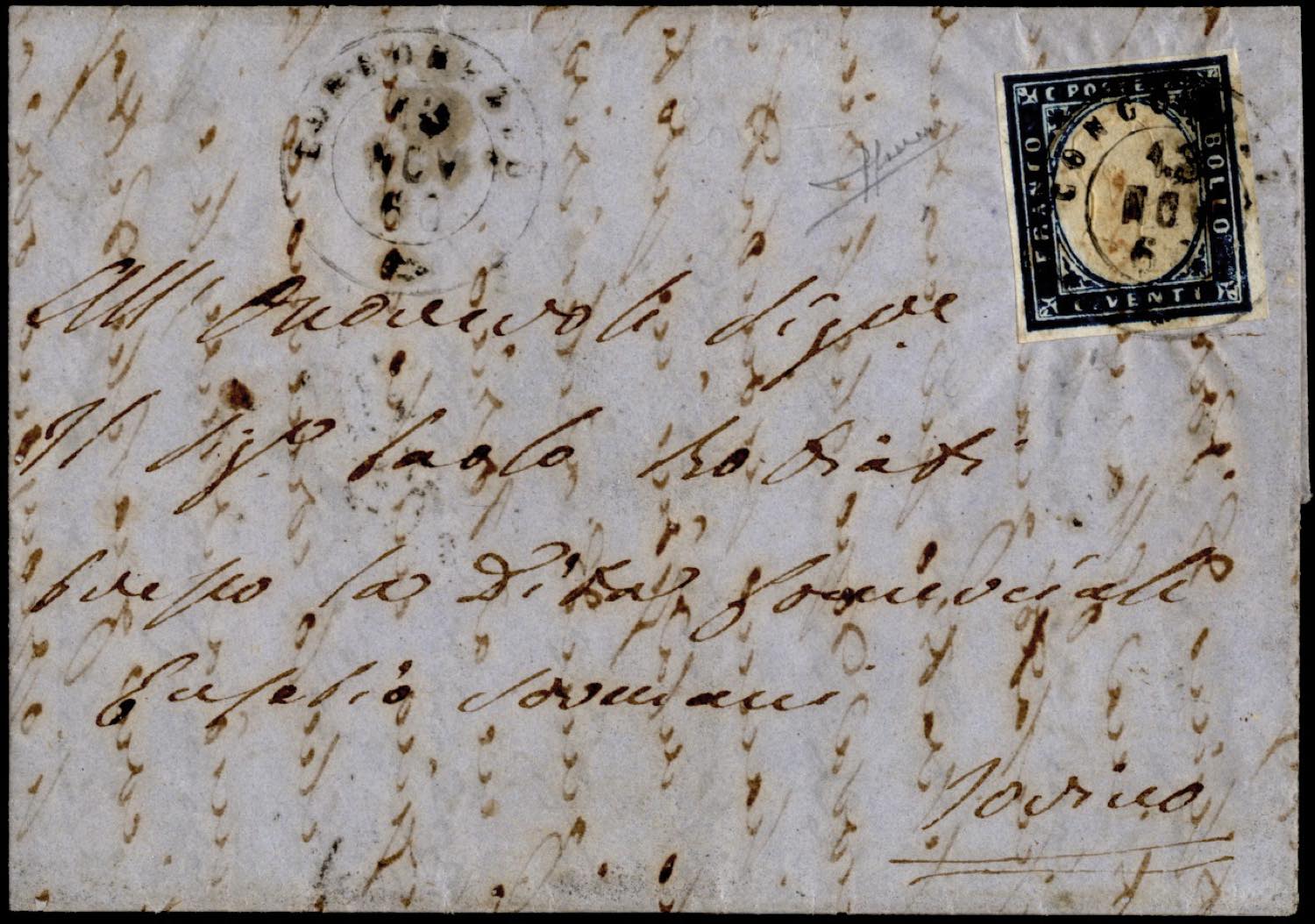 CONCOREZZO, punti 11 - 20 cent. (Sardegna 15C), perfetto, su lettera del 13/11/1860 per Torino. Prima data nota di questo annullo. Cert. Sorani.