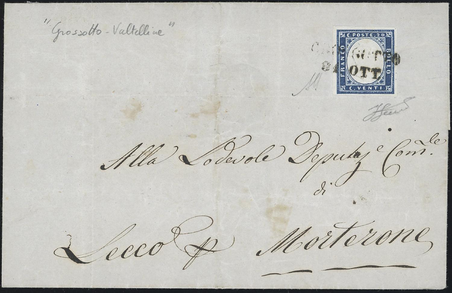 GROSSOTTO, SD punti 10 - 20 cent. (15Aa), perfetto, su sovracoperta di lettera del 31/10/1859 a Morterone. Ferrario, A.Diena.