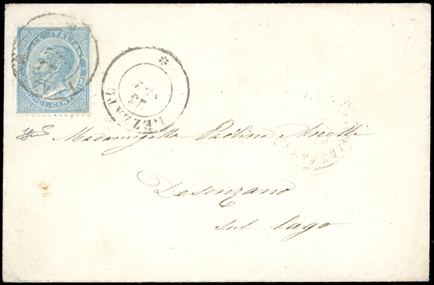 REZZATO, sardo italiano senza anno, non catalogato - 15 cent. (Regno L18), perfetto, su busta del 23/9/1864 a Desenzano. Interessante. ... Leggi tutto