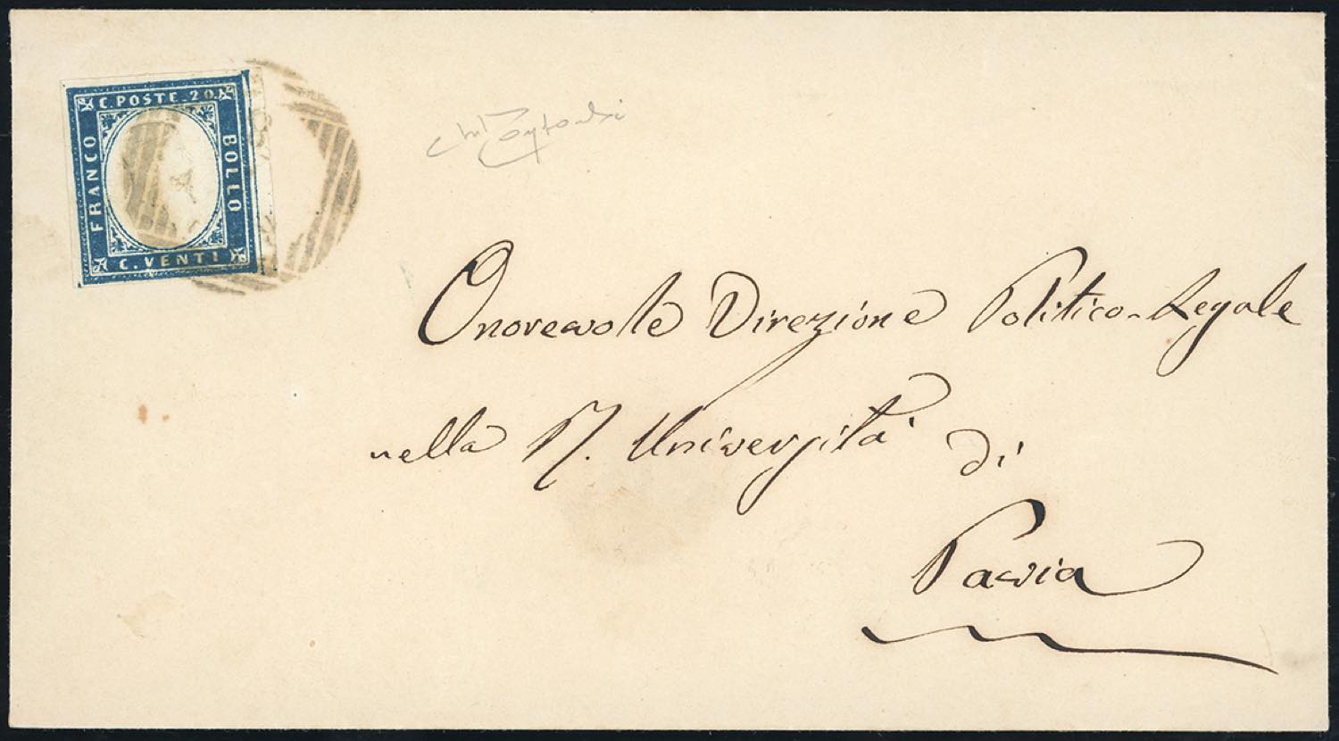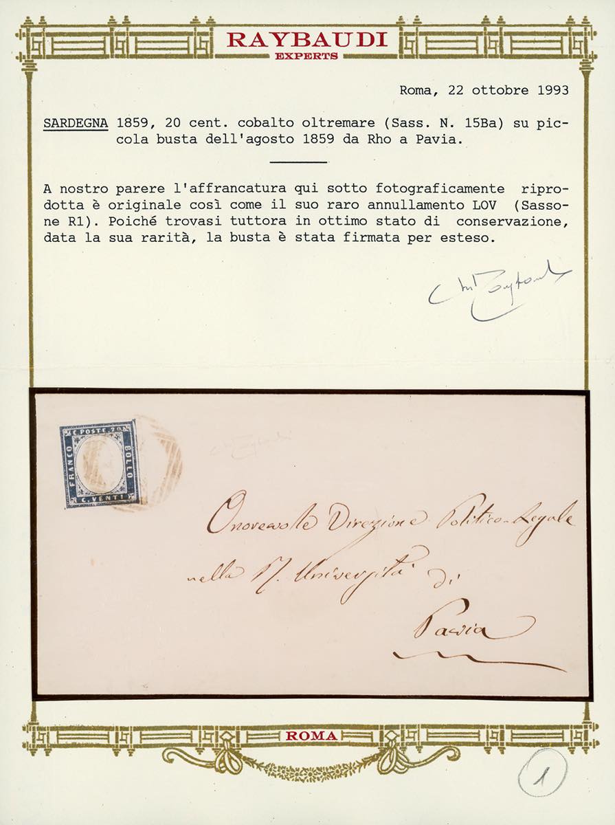 RHO, LOV punti R1 - 20 cent. IV emissione di Sardegna (15Ba), perfetto, su busta dell'agosto 1859 per Pavia. Rara e molto bella, Cert. Oro ... Leggi tutto
