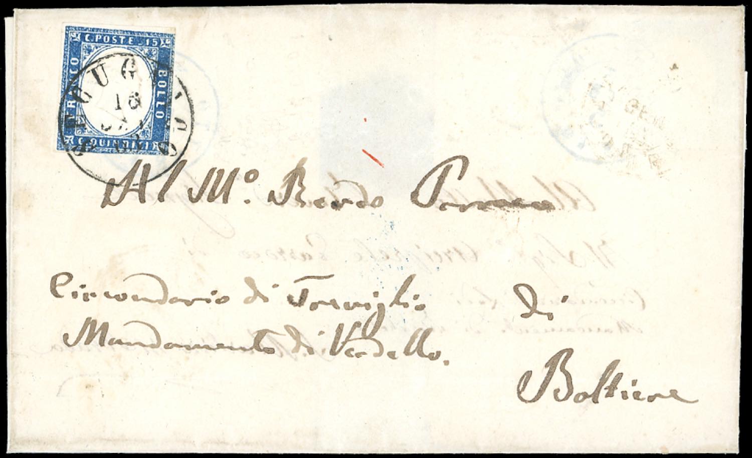 SECUGNAGO, OSIO SOTTO, punti 12+11 - 15 cent. tipo Sardegna (11), leggermente corto, su sovracoperta di lettera da Secugnago 12/1/1863 a ... Leggi tutto