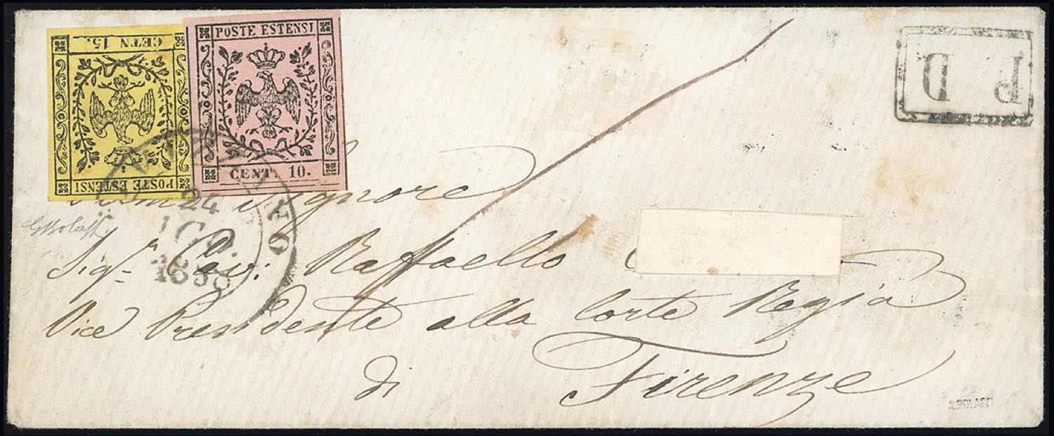 1858 - 15 cent. giallo, errore tipografico "CETN 15." e 10 cent. rosa, con punto dopo le cifre (3d,9), perfetti, su busta, indirizzo parzialmente ritagliato, da Fivizzano 24/8/1858 a Firenze. G.Bolaffi.
