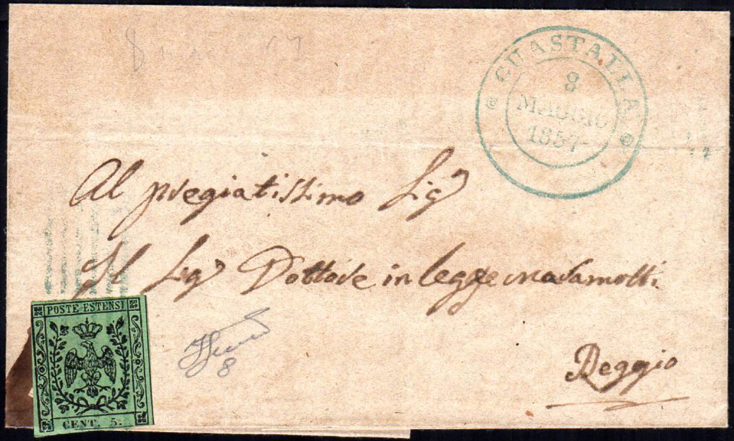 1857 - 5 cent. verde oliva (8), perfetto, su lettera da Guastalla 8/5/1857 a Reggio. Ferrario.