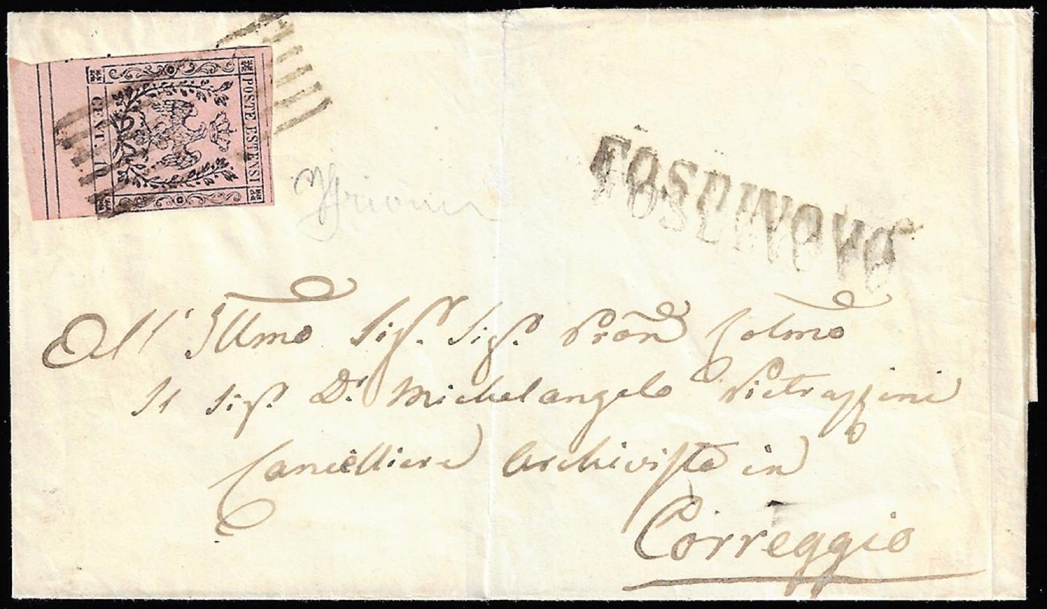 FOSDINOVO, 6 sbarre + lineare punti 10 - 10 cent. (2), bordo di foglio in basso con interspazio di gruppo, giusto a destra, su sovracoperta di lettera per Correggio, al verso transito di Reggio 6/11/1854. Grioni.
