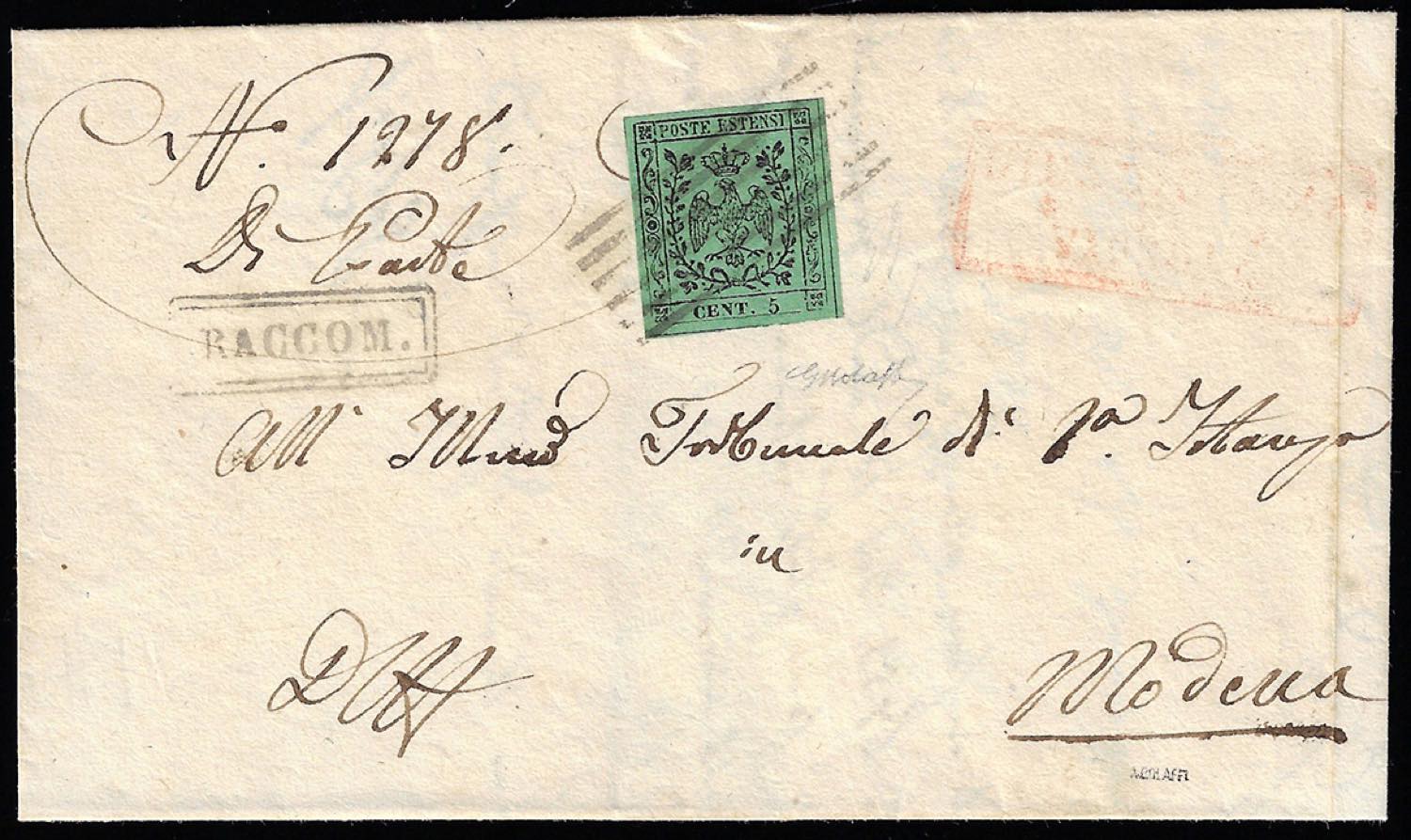 VIGNOLA, sei sbarre + RACCOM. Punti 12 - 5 cent. (1), perfetto, su lettera raccomandata (manca il 25 cent. al verso), del 24/9/1855 per Modena. Si tratta probabilmente dell'unica lettera nota da questa località senza il bollo nominativo sul fronte. G.Bolaffi.