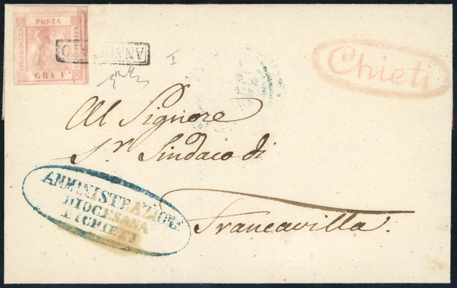 1858 - 1 grano rosa chiaro, I tavola (3), perfetto, isolato su sovracoperta di lettera da Chieti a Francavilla. Interessante uso isolato per il distretto, di eccezionale freschezza. Chiavarello.