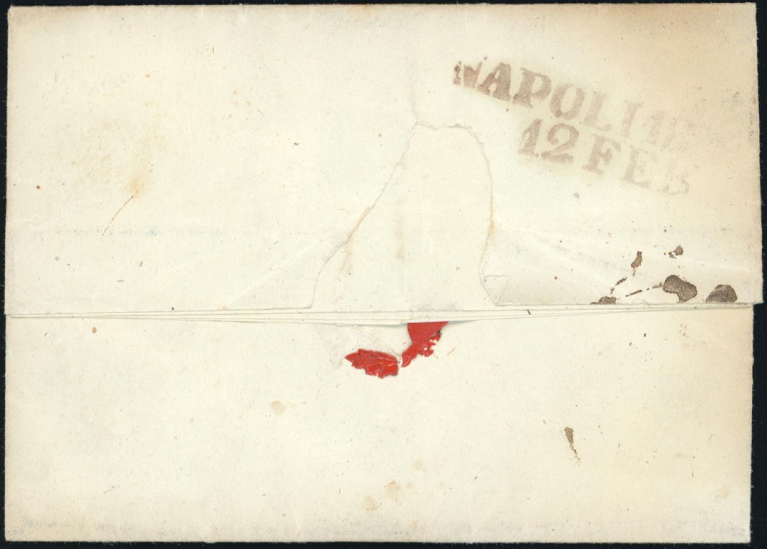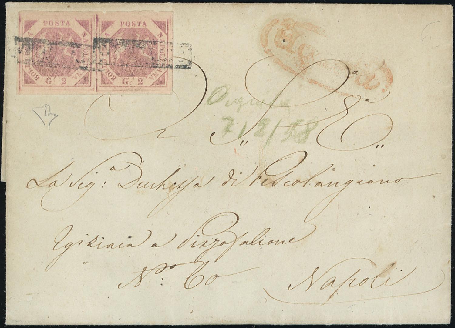 1858 - 2 grana lilla rosa, I tavola (5b), coppia orizzontale, perfetta, su lettera da L'Aquila 7/2/1858 a Napoli. Rara! Cert. Diena.