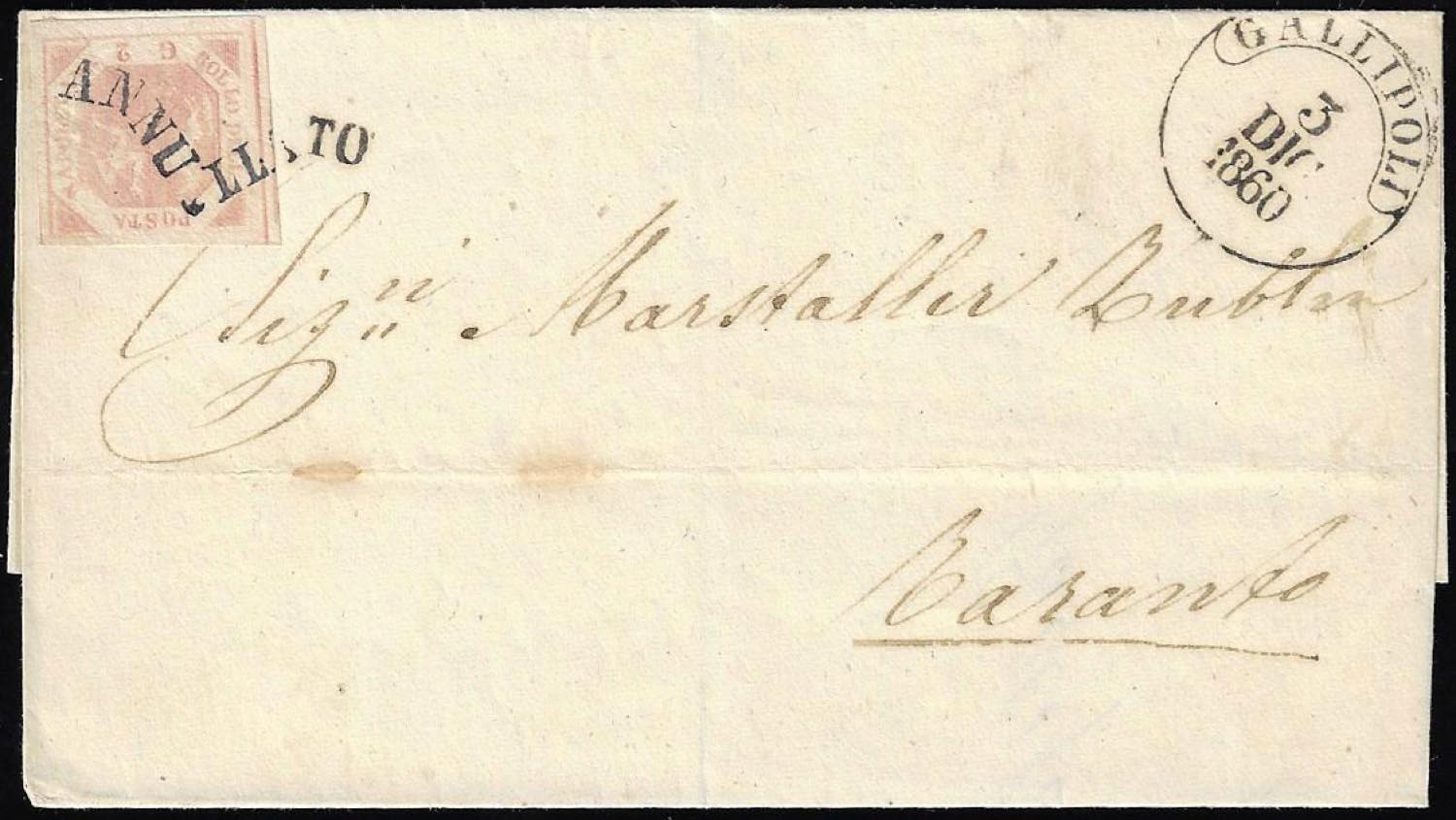 1860 - 2 grana rosa chiaro, III tavola (7b), perfetto, su sovracoperta di lettera da Gallipoli 3/12/1860, annullo a svolazzo, a Taranto. Interessante lettera in periodo di Luogotenenza di Luigi Farini.