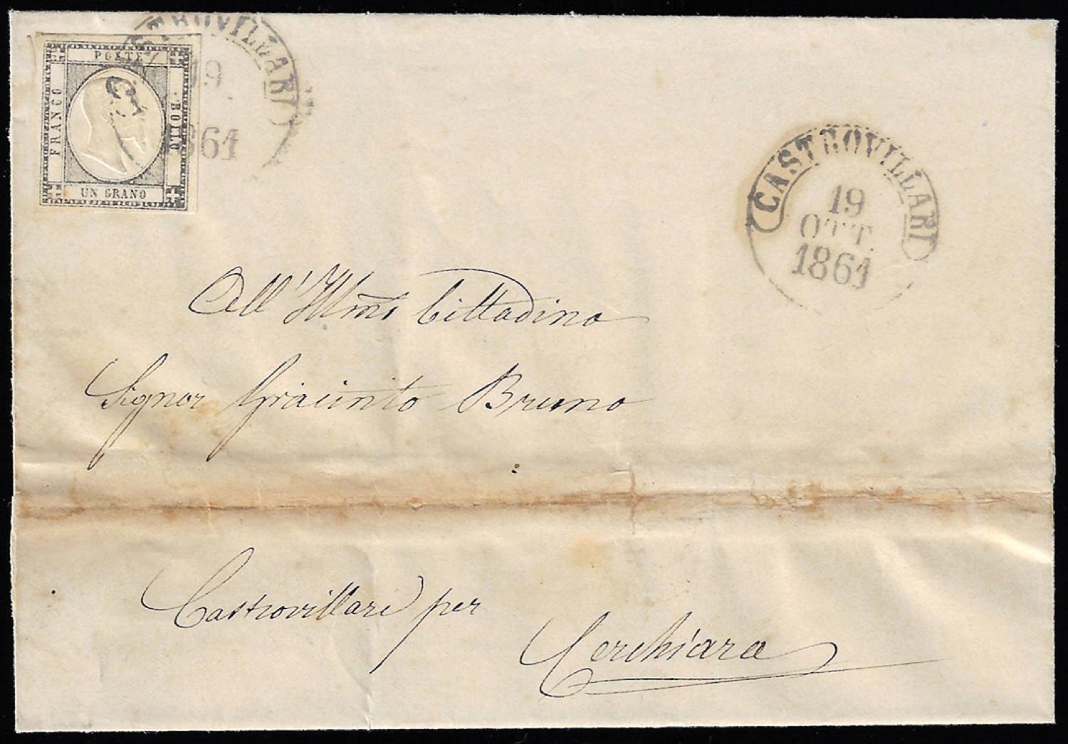 1861 - 1 grano grigio scuro (19a), perfetto, isolato su sovracoperta di lettera da Castrovillari 19/10/1861 a Cerchiara. Tariffa per il distretto molto rara!