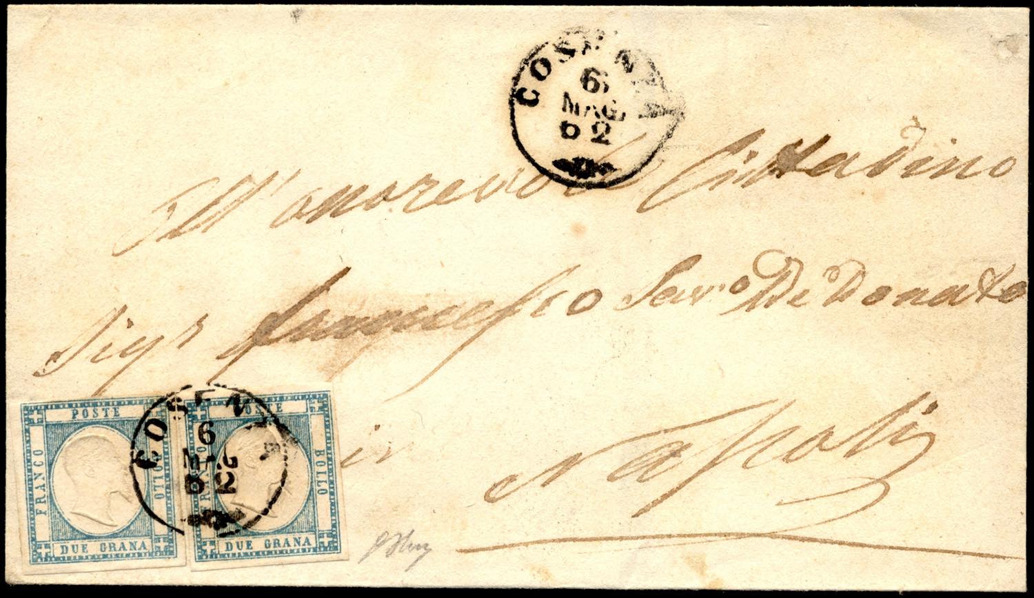 1862 - 2 grana azzurro chiaro (20), due esemplari, perfetti, su sovracoperta di lettera da Cosenza 6/5/1862 a Napoli. G.Oliva.