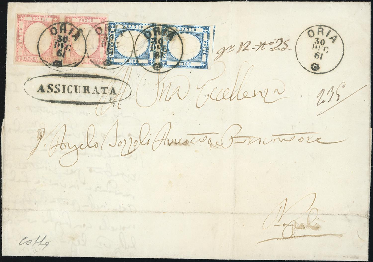 1861 - 5 grana rosa, 2 grana azzurro (21e,20b), entrambi coppie, perfette, su lettera assicurata da Oria 30/12/1861 per Napoli. Pregevole insieme. Cert. Colla.