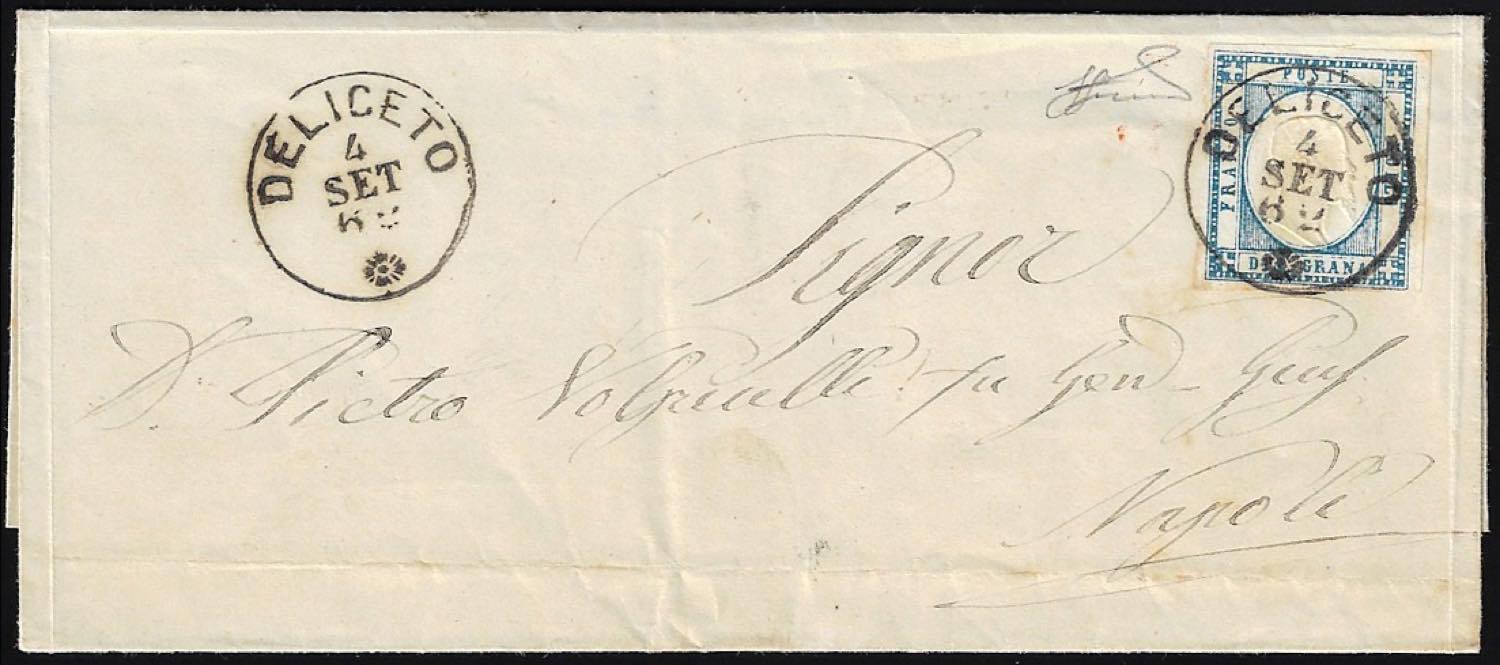 DELICETO, cerchio piccolo punti 10 - 2 grana (20), perfetto, su sovracoperta di lettera del 4/9/1862 per Napoli. Bella. Ferrario.