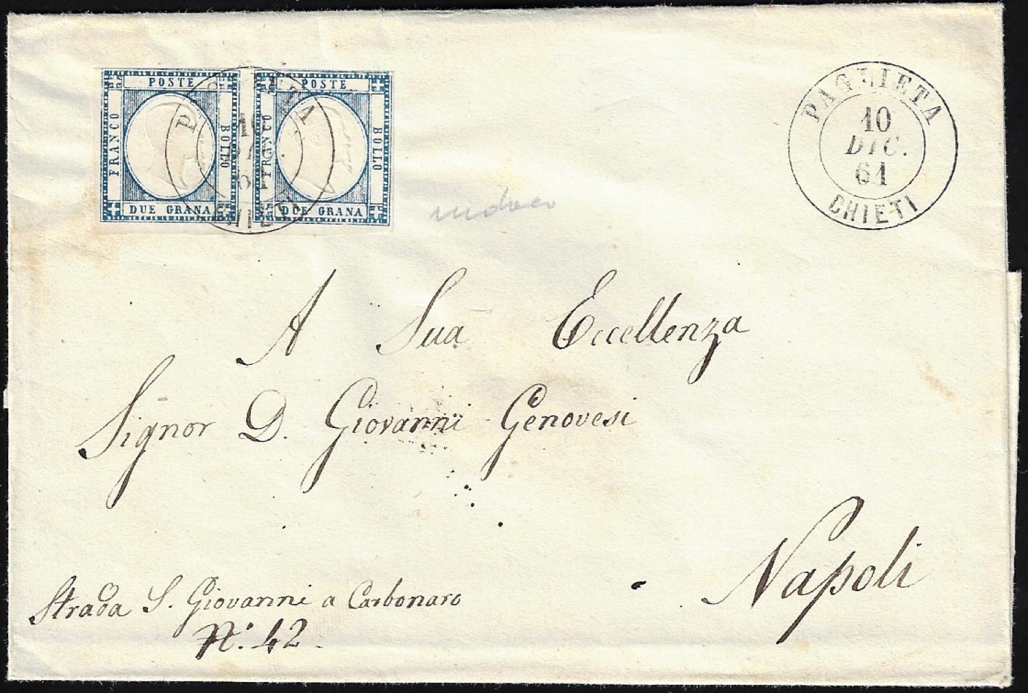 PAGLIETA, doppio cerchio punti 9 - 2 grana indaco chiaro (20e), coppia, giusta in alto, su sovracoperta di lettera del 10/12/1861 per Napoli.