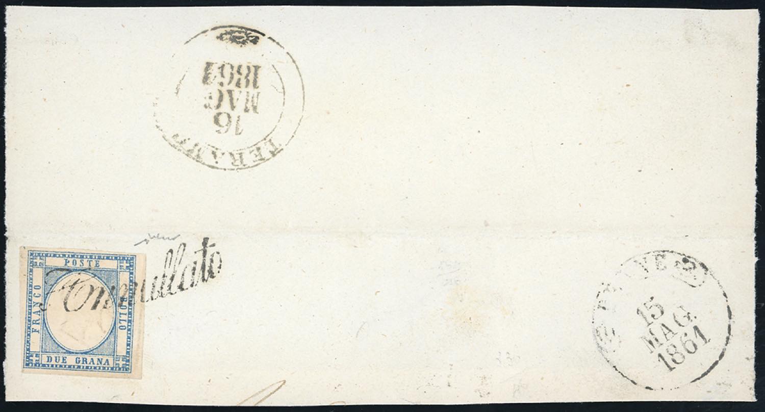 PENNE, svolazzo + cerchio punti R1 - 2 grana (20), perfetto, su ampio frammento di lettera del 15/5/1861 a Teramo. Raro annullo. ... Leggi tutto