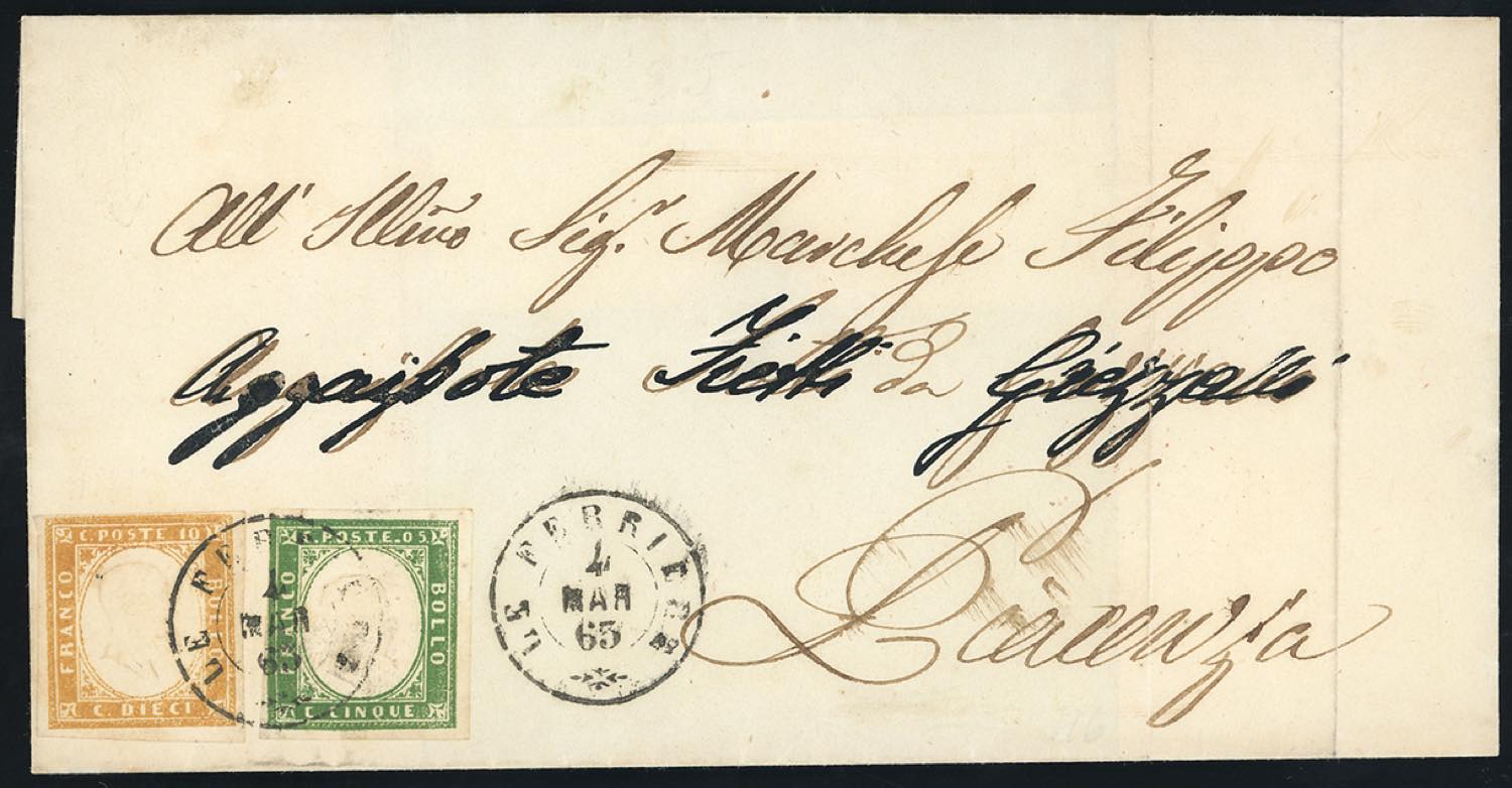 LA FERRIERE, sardo italiano punti 11 - 5 cent., 10 cent. IV emissione di Sardegna (13Ea,14E), margini completi, su lettera del 4/3/1863 per ... Leggi tutto