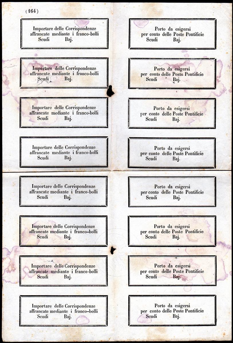 1852 ca - Foglio completo di 16 etichette di modulistica postale, otto con la dicitura "Importare delle corrispondenze affrancate mediante i franco-bolli", otto con "Porto da esigersi per conto delle Poste Pontificie", alcune macchie d'umidità. Insieme molto raro!