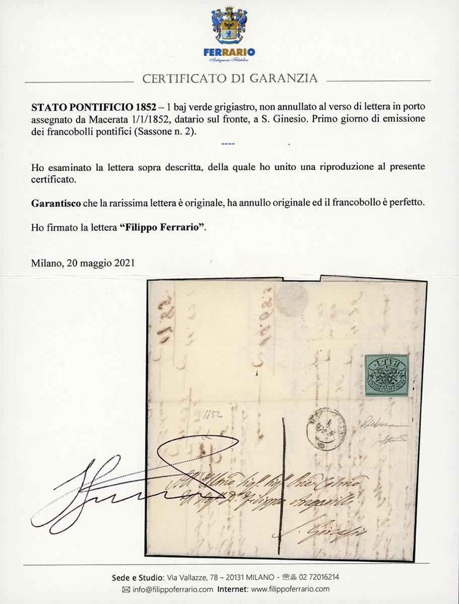 1852 - 1 baj verde grigiastro (2), perfetto e con grandi margini, non annullato al verso di lettera in porto assegnato da Macerata 1/1/1852, datario sul fronte, a S.Ginesio. Rara e splendida lettera risalente al PRIMO GIORNO DI EMISSIONE dei francobolli pontifici. Cert. R.Diena, Ferrario (cat.Sassone € 90.000/120.000).
