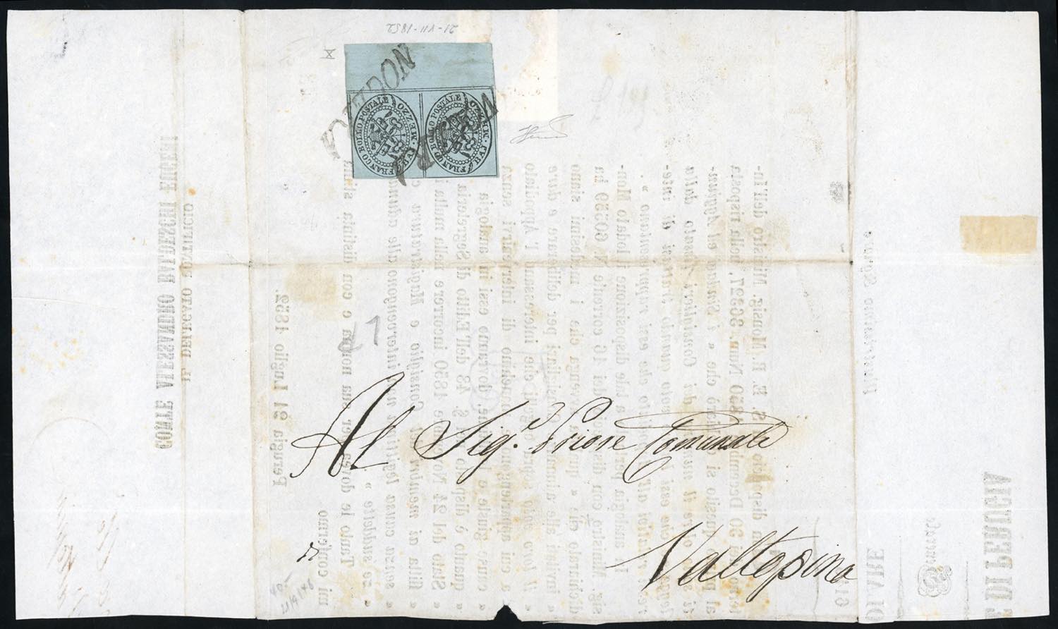 1852 - 1/2 baj grigio azzurro (1a), coppia verticale, perfetta e ben marginata, bordo di foglio, al verso di gran parte di manifesto in porto assegnato da Nocera 21/7/1852, punti 10, a Valtopina. Splendida. Cert. Ferrario. Ex coll. Andreotti.