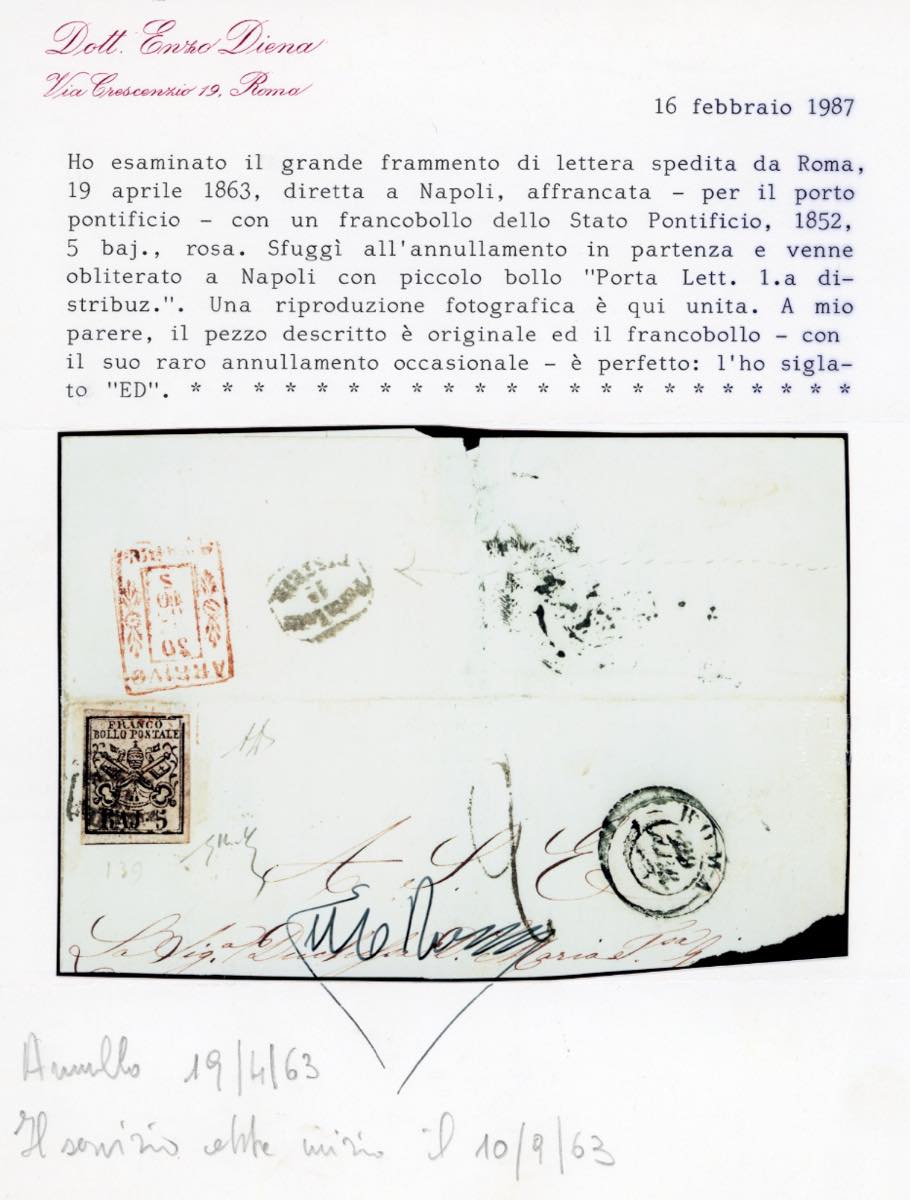 1863 - 5 baj rosa carminio (6A), perfetto, su testatina di lettera con parte del verso da Roma 19/4/1863 a Napoli. Il francobollo non annullato in partenza, è stato annullato in arrivo a Napoli con il timbrino "Porta Lett. 1a distribuz.". UNICO CASO NOTO. A.Diena, Chiavarello, cert. E.Diena.