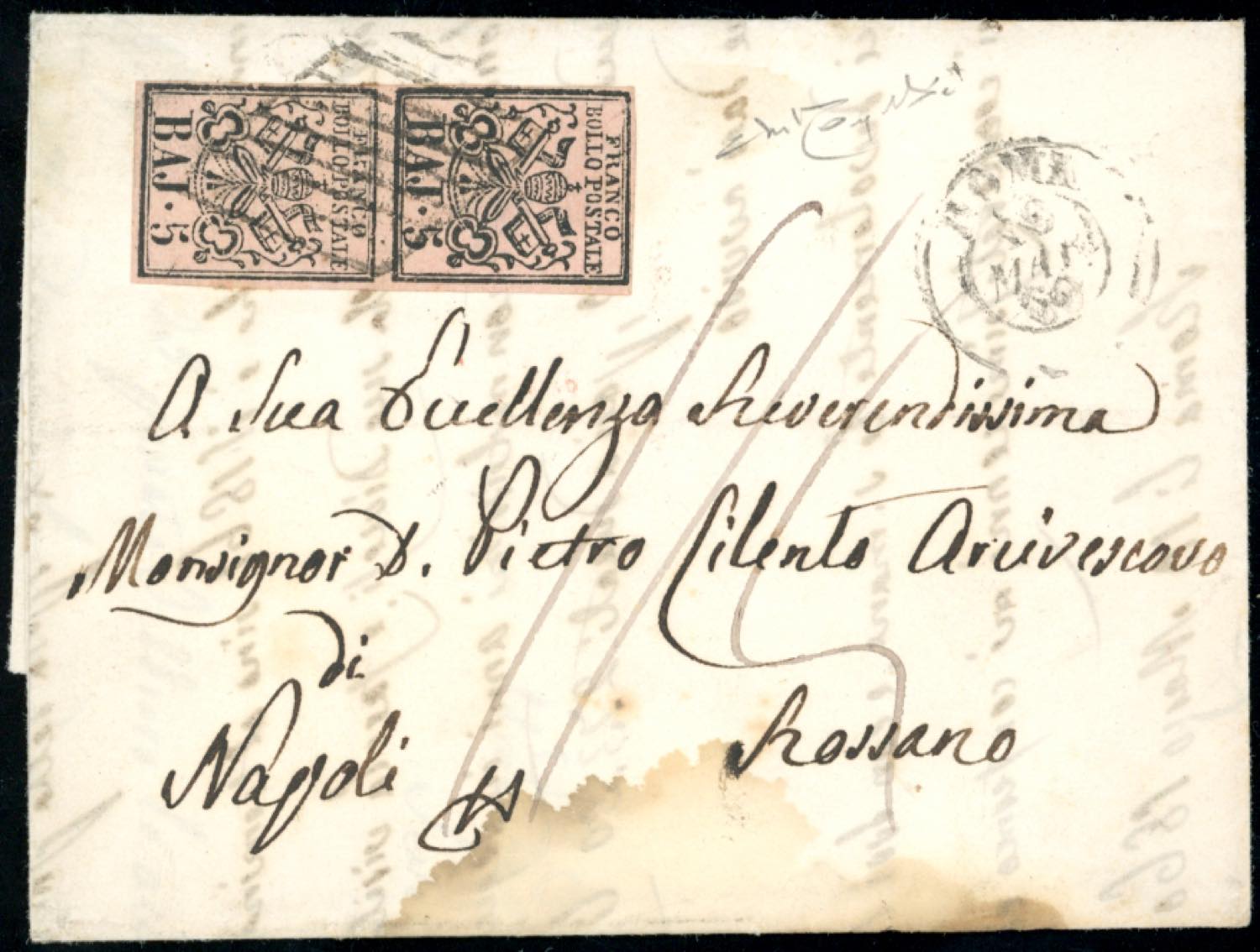 1860 - 5 baj rosa carminio (6A), coppia, perfetta, su lettera da Roma 10/3/1860 a Rossano, tassata. Cert. Raybaudi.