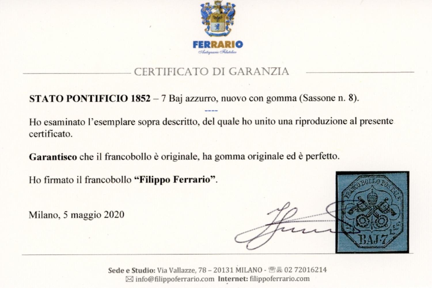 1852 - 7 baj azzurro (8), nuovo, gomma originale, perfetto. Molto bello! A.Diena, cert. Ferrario.