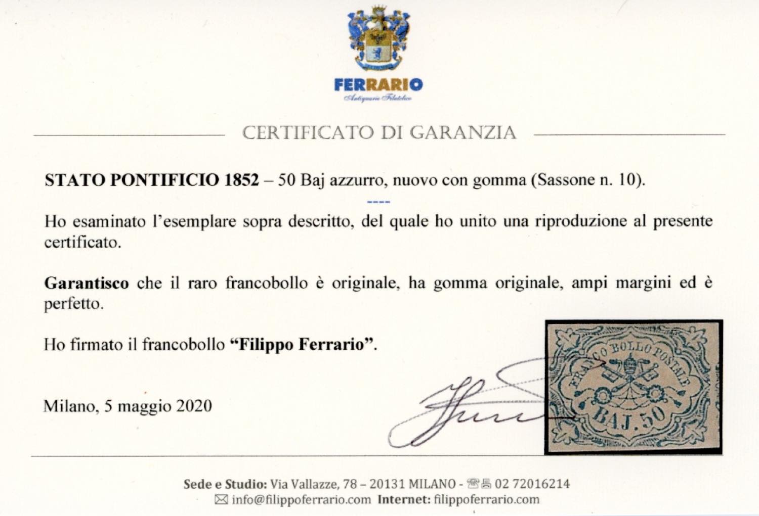 1852 - 50 baj azzurro (10), parte del francobollo adiacente a destra, ottimi margini, nuovo, gomma originale, perfetto. Splendido ed estremamente raro. Emilio ed Alberto Diena per esteso, cert. Ferrario.