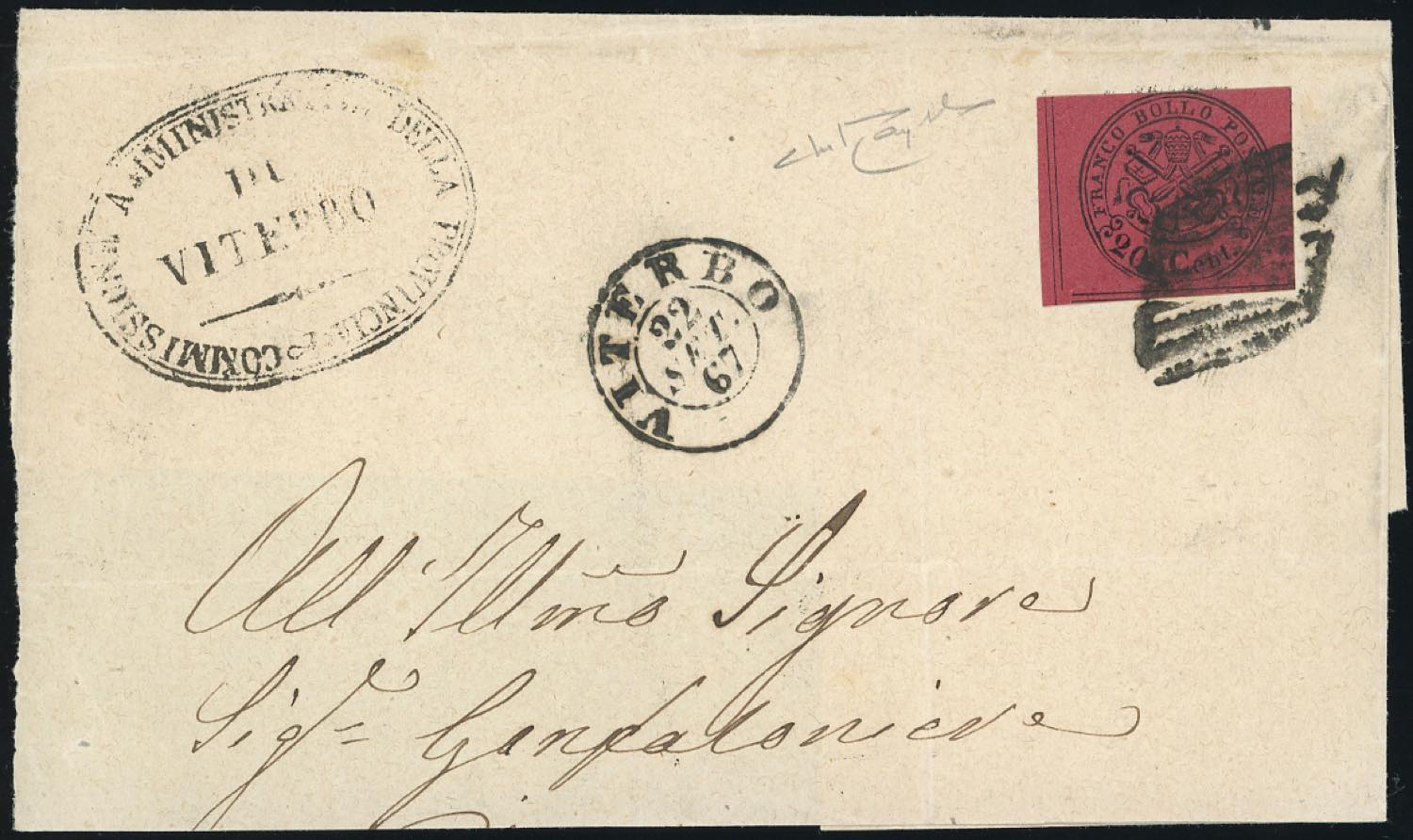 1867 - 20 cent. rosso bruno (18), ottimo stato, su lettera non completa da Viterbo 22/9/1867, secondo giorno d'uso. Non comune! Raybaudi.