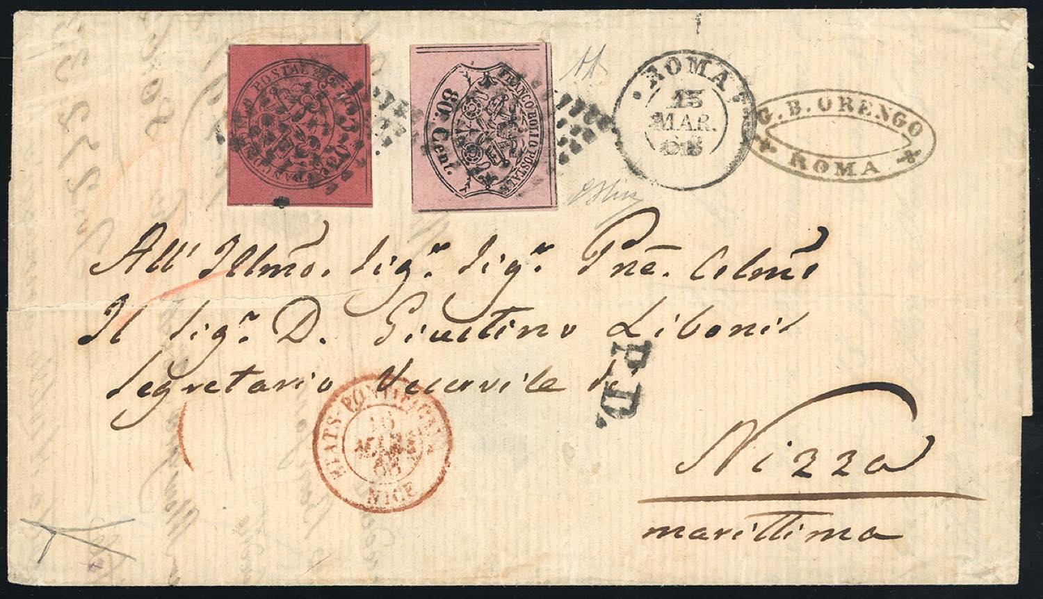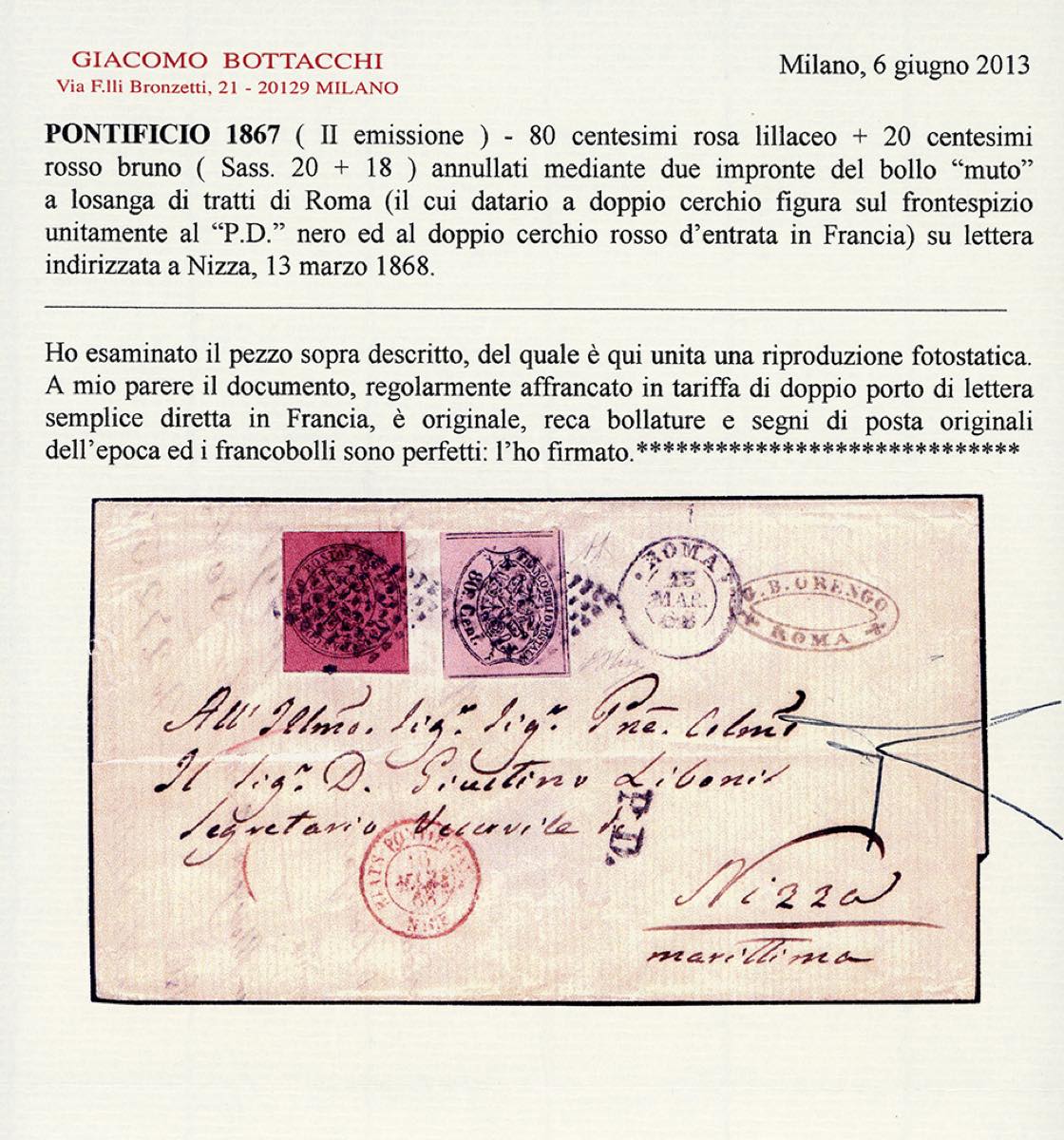 1868 - 80 cent. e 20 cent., non dentellati, II emissione (18,20), perfetti, su fresca lettera da Roma 15/3/1868 a Nizza in Francia, doppio porto. Molto bella. A.Diena, G.Oliva, cert. Bottacchi.