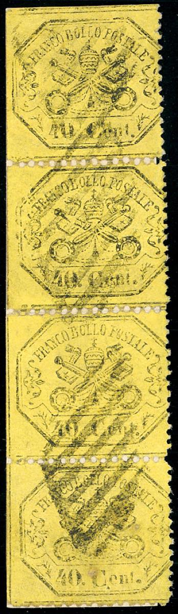 1868 - 40 cent. giallo (29b), striscia verticale di quattro, perfetta, usata su minimo frammento. Em. ed A.Diena. Ex coll. Imperato.