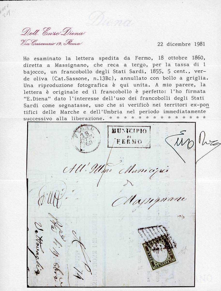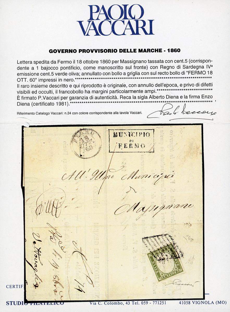 1860 - 5 cent. verde oliva (13Bc), perfetto, al verso di lettera in porto assegnato da Fermo 18/10/1860 a Massignano, tassata 1 baj. Rara lettera risalente ai primissimi giorni di introduzione delle tariffe sarde, tassata però ancora secondo la normativa pontificia. Qualità eccezionale! A.Diena, cert. E.Diena e Vaccari.