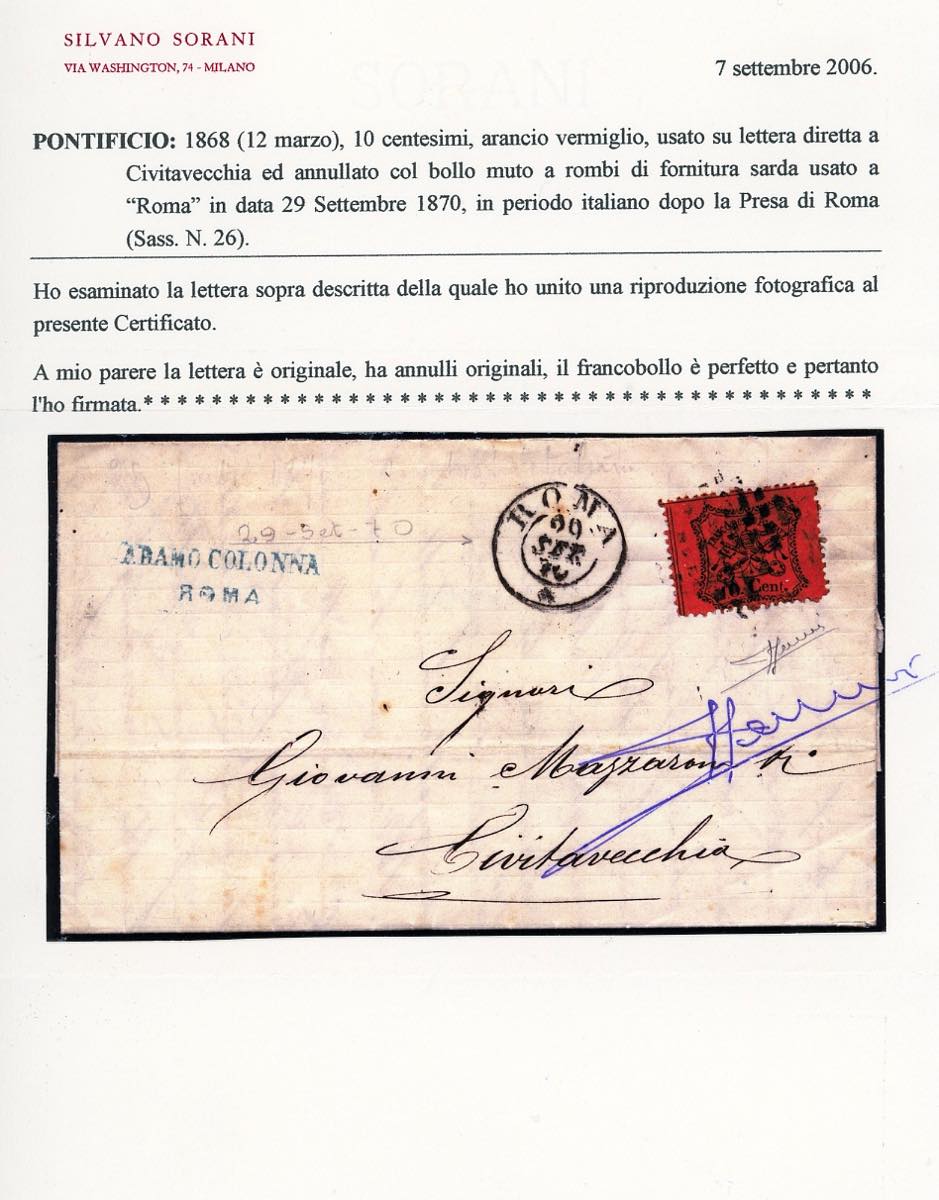 1870 - 10 cent. (26c), perfetto, su lettera da Roma 29/9/1870 a Civitavecchia. Pregevole lettera in periodo di Giunta Provvisoria di Governo, di ottima qualità. Cert. Sorani.