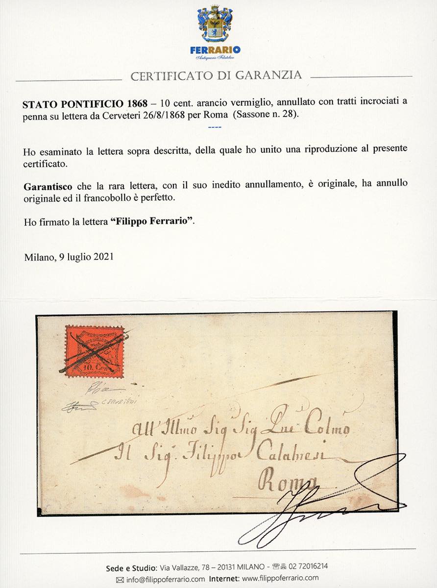 ACQUAPENDENTE, bollo di tassa "20" unico annullatore, punti R1 - 1 baj (2), perfetto, al verso di lettera in porto assegnato del 27/7/1854 a Grotte di Castro, tassato 1 baj. Molto rara, probabilmente unica. Cert. Sorani.