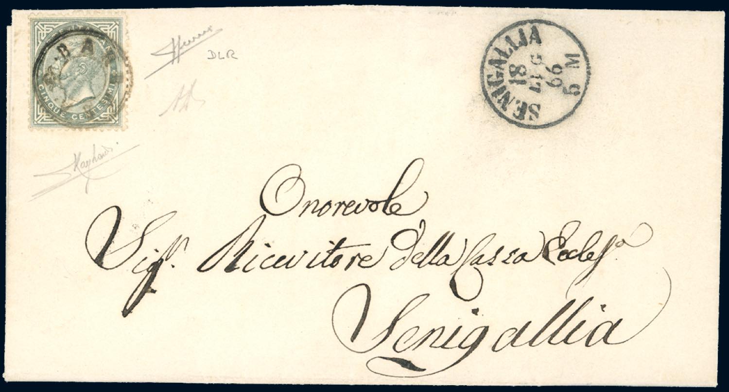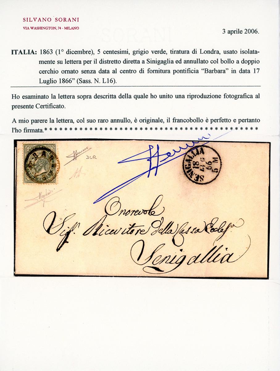 BARBARA, punti 13 - 5 cent. (Regno L16), perfetto, su lettera del 17/7/1866 per Senigallia. Annullo di fornitura pontifica molto raro, di ottima qualità. A.Diena, Raybaudi, cert. Sorani.