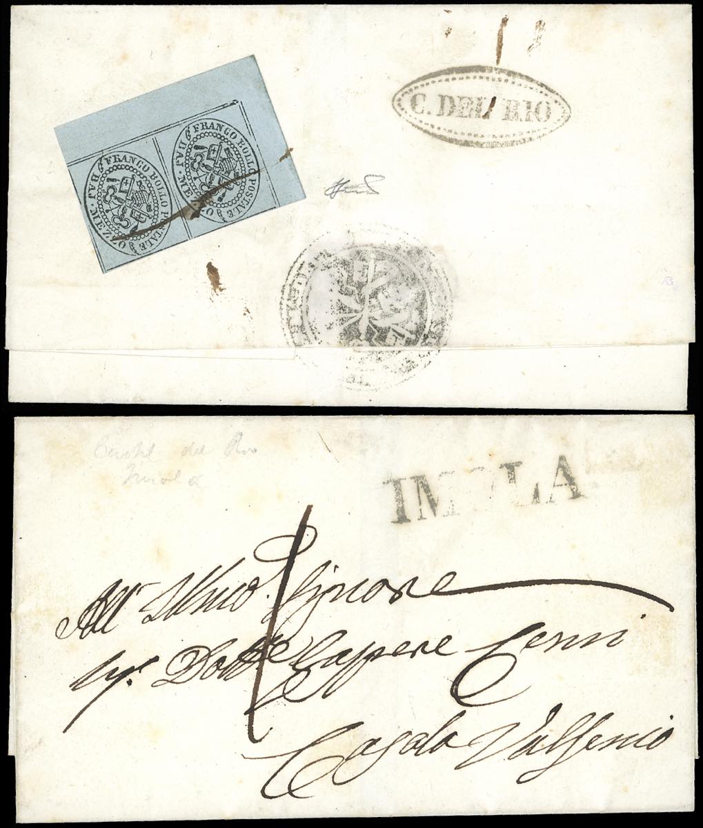 CASTEL DEL RIO, punti 8 - 1/2 baj (1a), coppia verticale, angolo di foglio, annullata con un tratto di penna, al verso di lettera in porto assegnato per Imola, tassata 1. Molto bella! Ferrario.