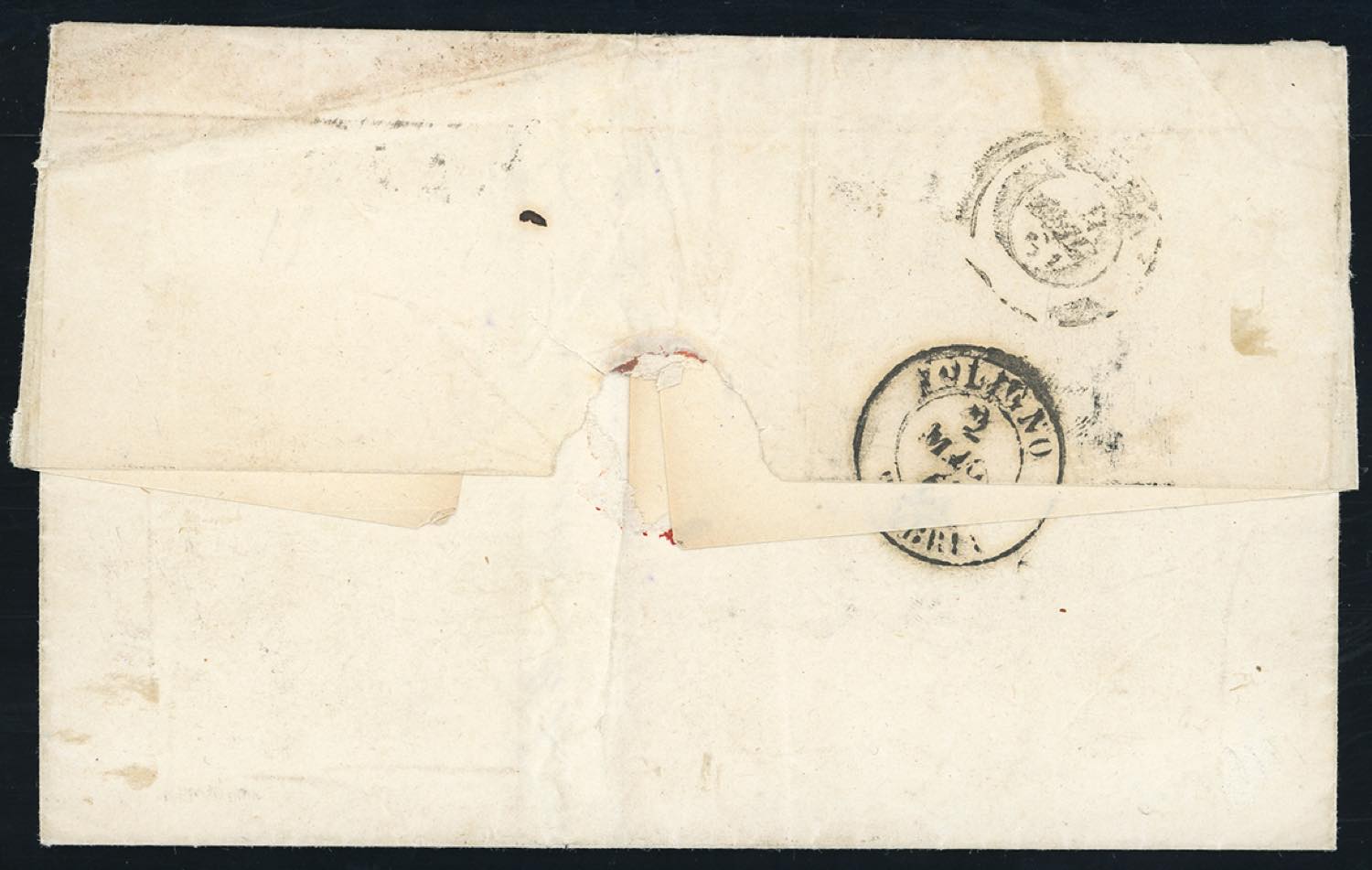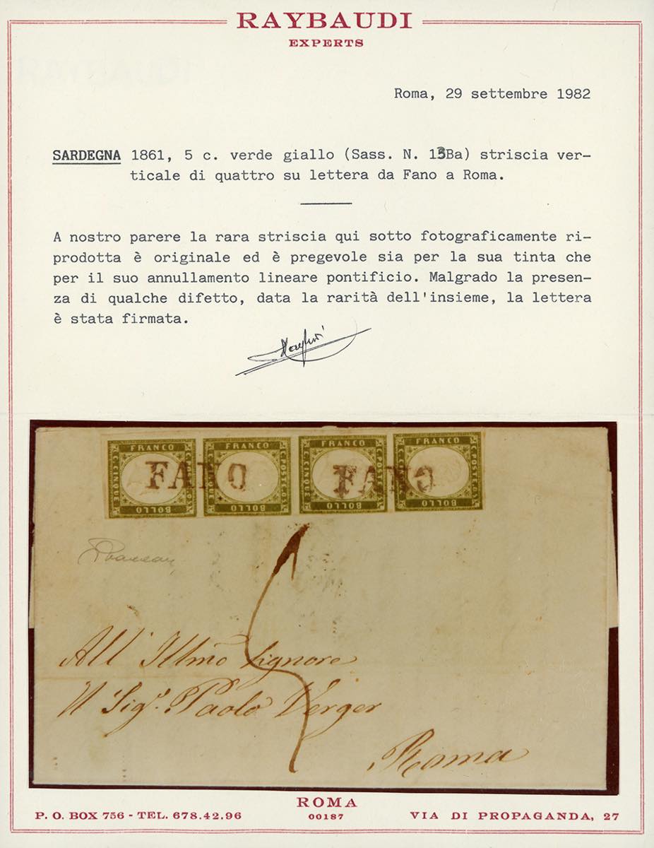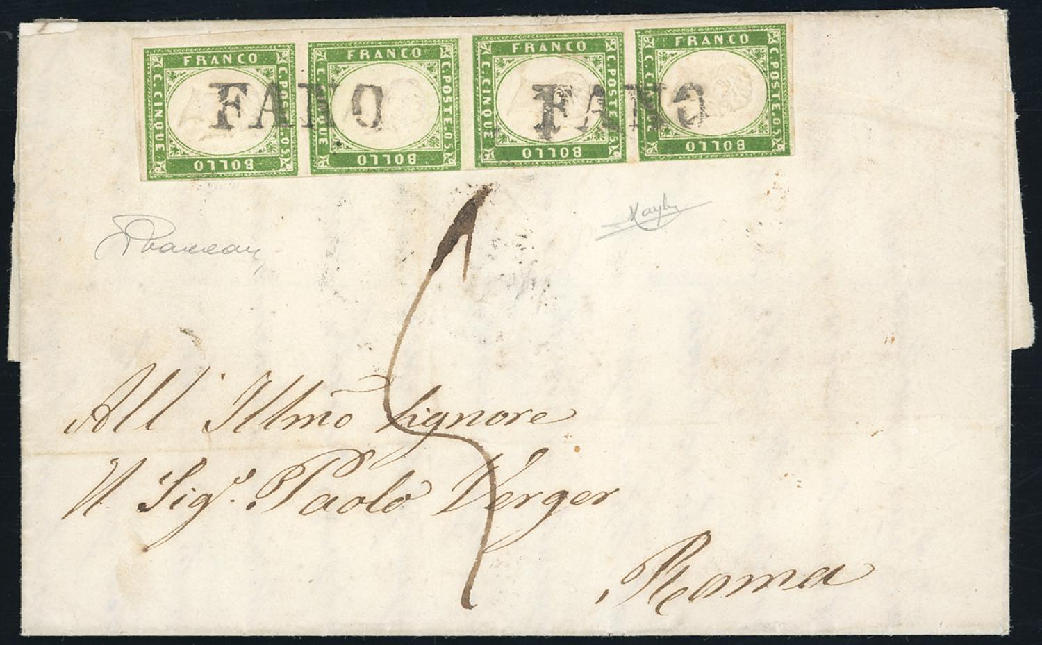 FANO, SD punti 10 - 5 cent. IV emissione di Sardegna (13Ba), striscia verticale di 4, a filo a destra, su fresca sovracoperta di lettera del 30/4/1861 per Roma, tassata 5 baj. Rara e di ottimo aspetto. Vaccari, cert. Raybaudi.