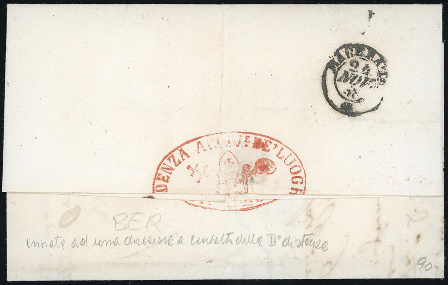 FERMO, penna non catalogato - 2 baj (3), perfetto, annullato con doppi tratti di penna incrociati, su sovracoperta di lettera del 23/11/1856 a Morrovalle. Annullamento inedito e probabilmente unico. Cert. Chiavarello.