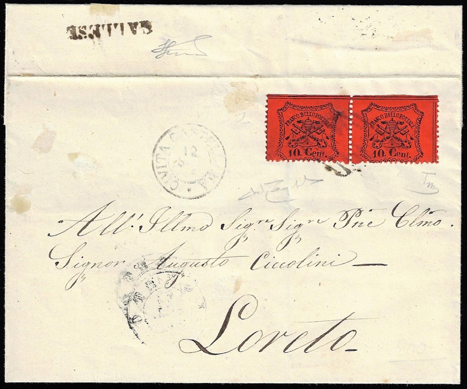 GALLESE, lineare punti 9 - 10 cent. arancio, coppia, margine di foglio in alto (26), perfetta, su lettera del 12/9/1868 per Loreto. Bella! ... Leggi tutto