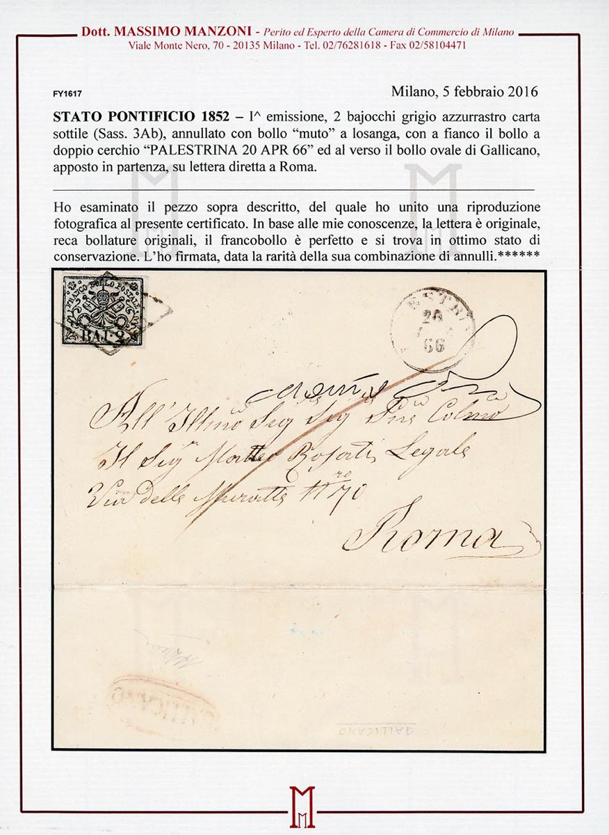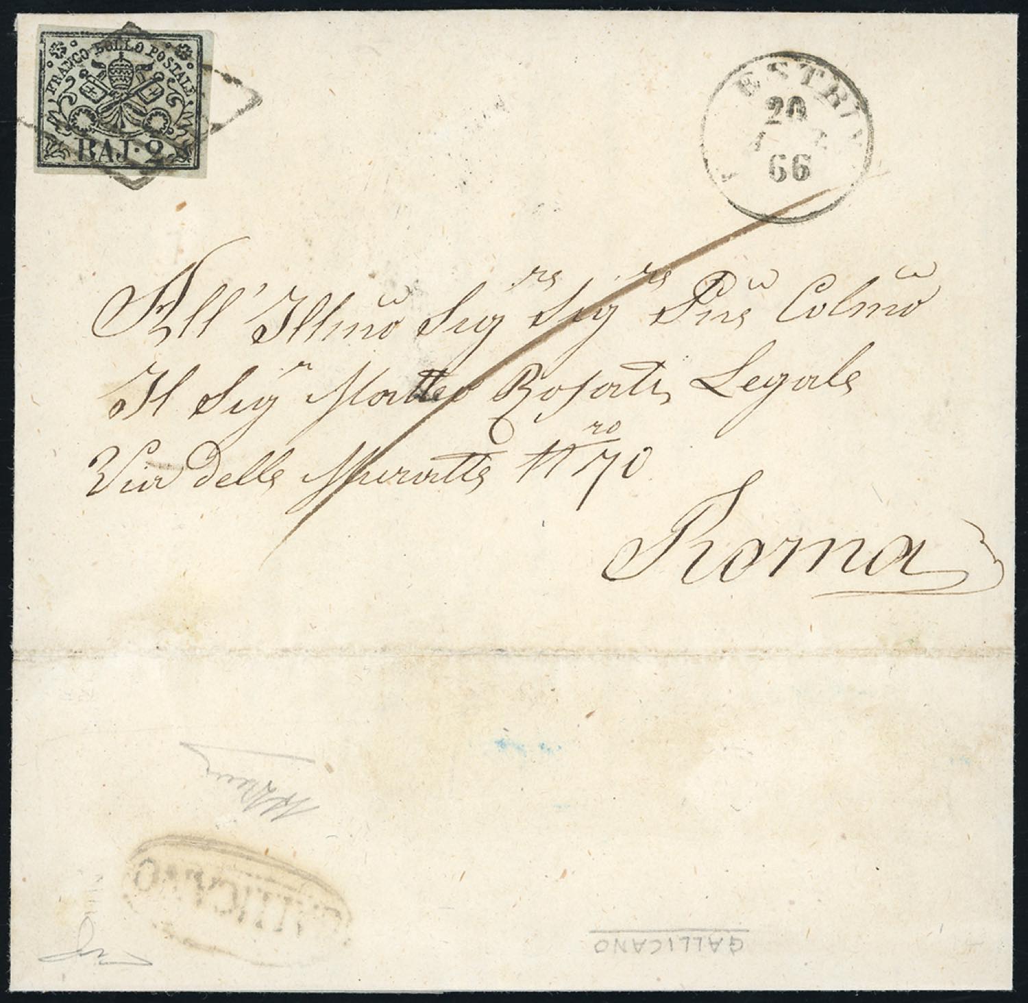 GALLICANO, punti R1 - 2 baj (3Ab), perfetto, su lettera del 20/4/1866 per Roma. TRE SOLE LETTERE NOTE, rarità del settore, di ottima qualità. A.Diena, cert. Manzoni. Ex coll. Andreotti.
