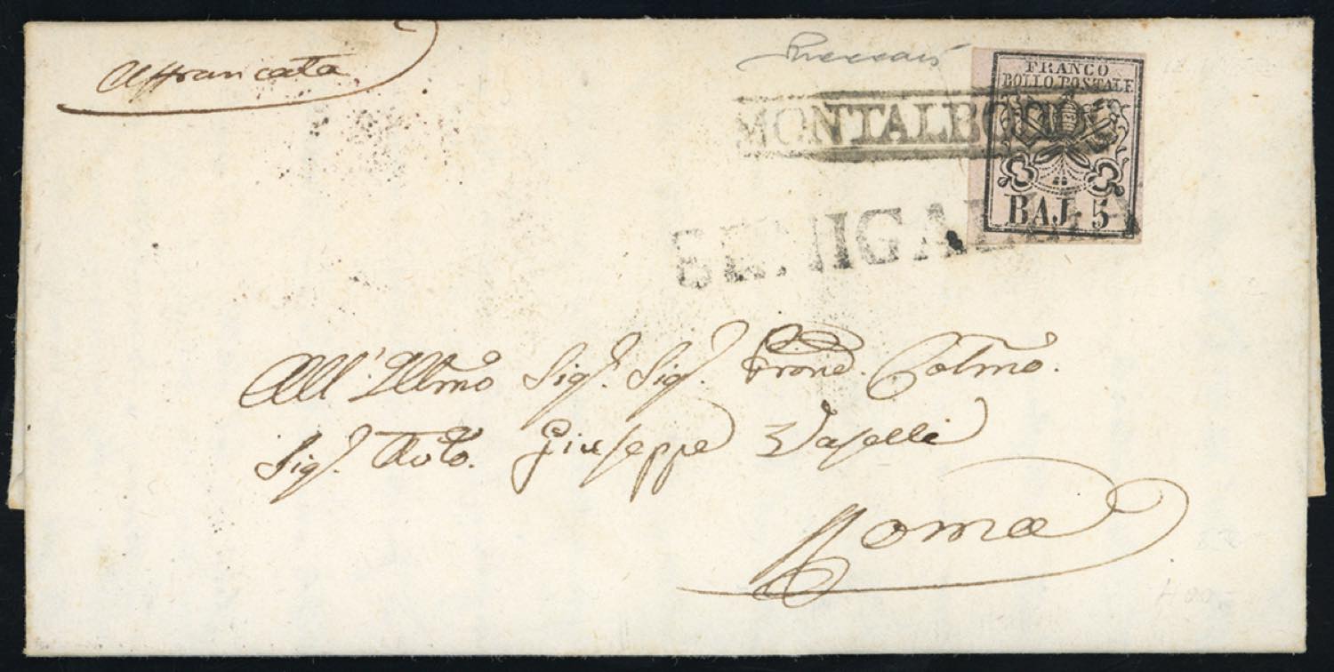 MONTALBODDO, coannullatore con SENIGALLIA, non catalogato - 5 baj (6), perfetto, su lettera del 10/1/1852 per Roma. Primissimi giorni d'uso dei francobolli nello Stato Pontificio e combinazione di annulli inedita. Vaccari.