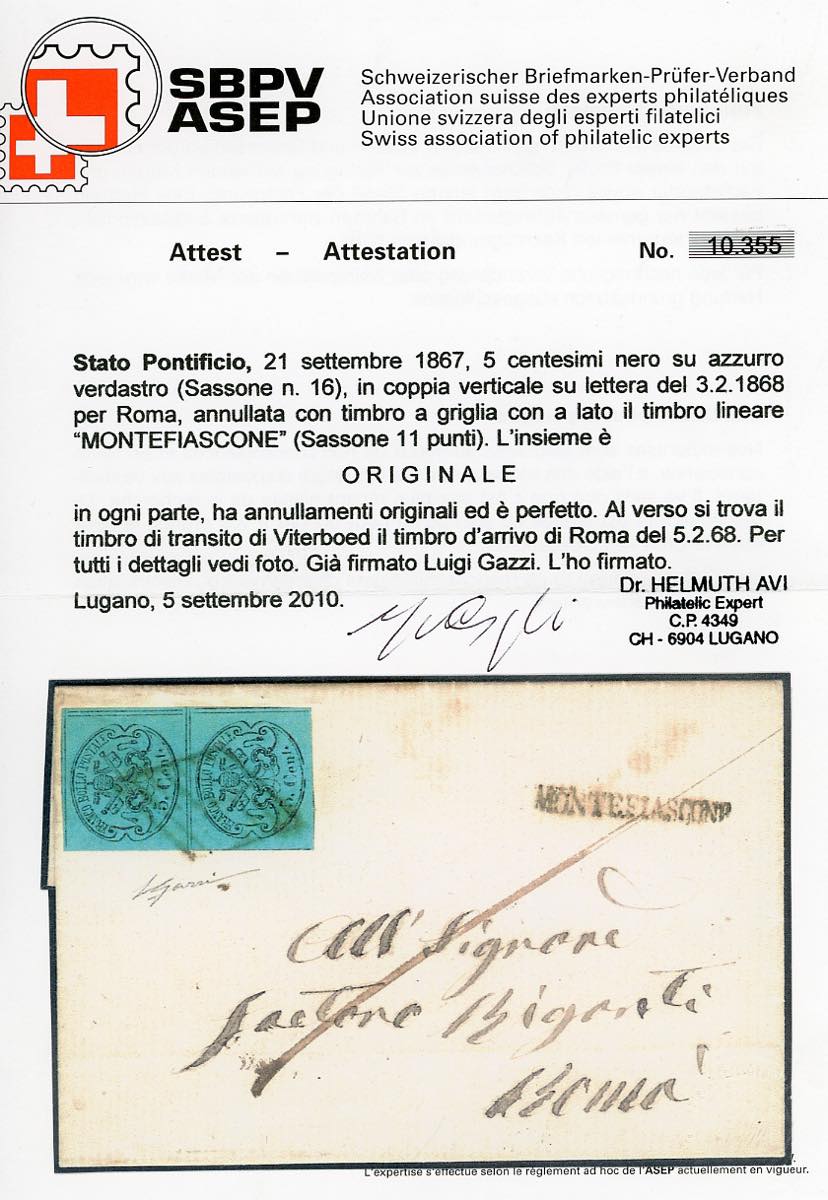 MONTEFIASCONE, SD punti 11 - 5 cent. (16), coppia, perfetta, su lettera del 3/2/1868 per Roma. Cert. Avi.