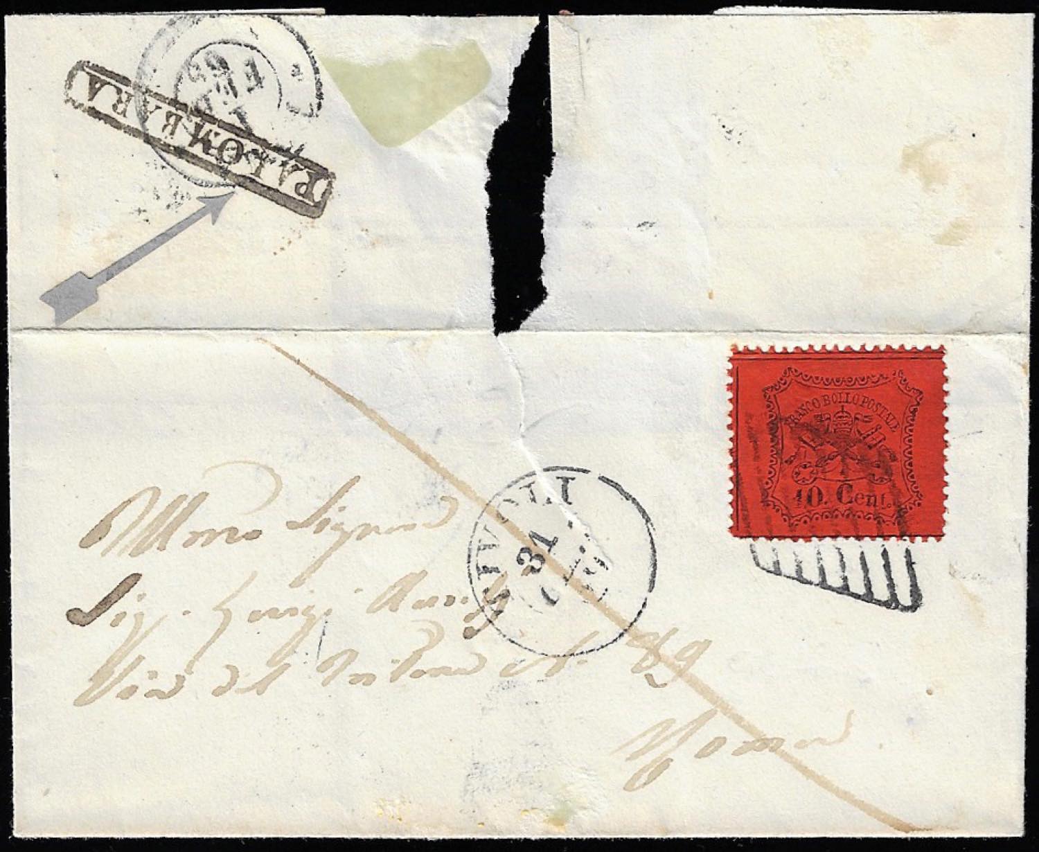 PALOMBARA, cartella al verso punti 10 - 10 cent. (26), perfetto, su sovracoperta di lettera per Roma, annullo di transito di Tivoli 31/1/1869. Ex coll. Andreotti.