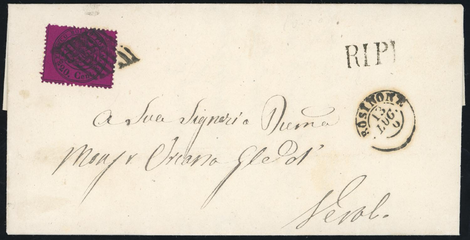 RIPI, punti 13 - 20 cent. (28), perfetto, su lettera del 13/7/1870 per Veroli. Molto bella.