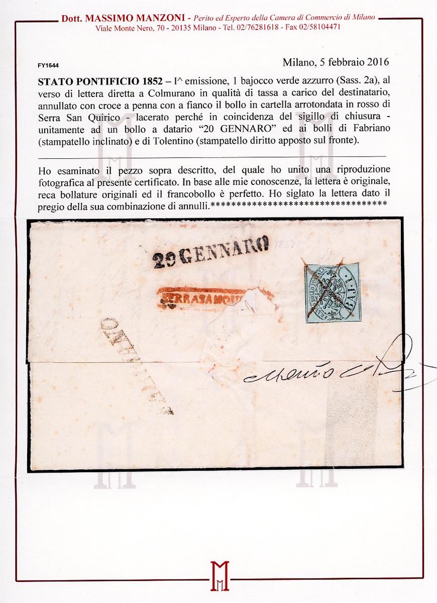 SERRA SAN QUIRICO, cartella rossa + penna, combinazione non catalogata - 1 baj (2a), perfetto, al verso di sovracoperta di lettera in porto assegnato per Colmurano. Combinazione di annulli inedita, raro insieme. Cert. Manzoni. Ex coll. Andreotti.